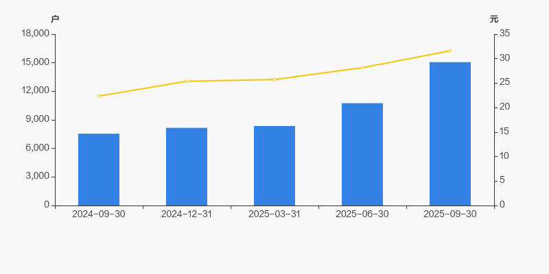自2024年9月30日以来,公司股东户数连续4期上涨,截至目前增幅为99.60%。2024年9月30日至2025年9月30日区间股价上涨41.39%。