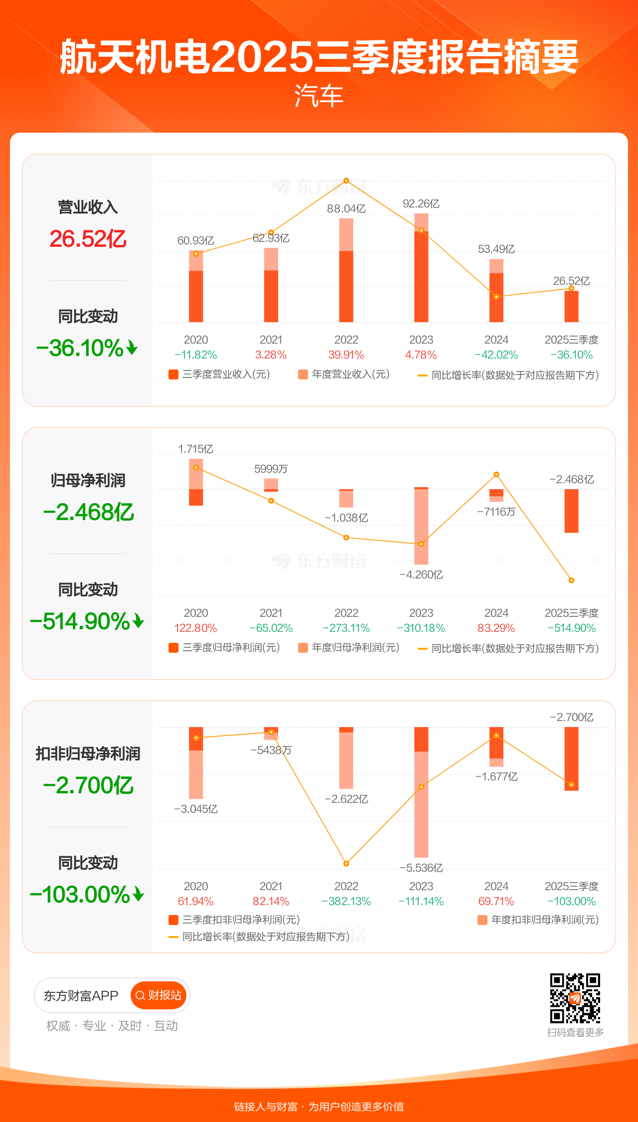 航天机电10月31日发布2025年三季报显示,公司前三季实现营业收入26.52亿元,同比下滑36.10%;归母净利润-2.47亿元;扣非归母净利润-2.70亿元。