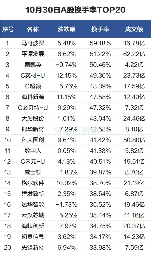 当天换手率最高的个股为马可波罗,全天换手率59.18%。平潭发展紧随其后,全天换手率51.22%。