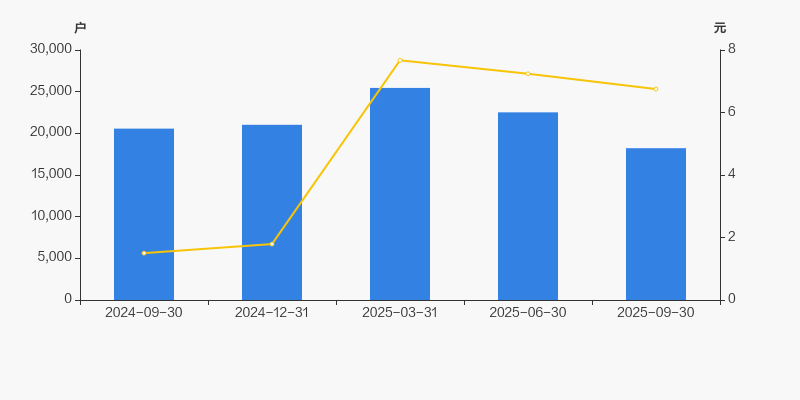 截至2025年9月30日,公司最新总股本为6.31亿股,其中流通股本为5.66亿股。户均持有流通股数量由上期的2.51万股上升至3.11万股,户均流通市值20.97万元。