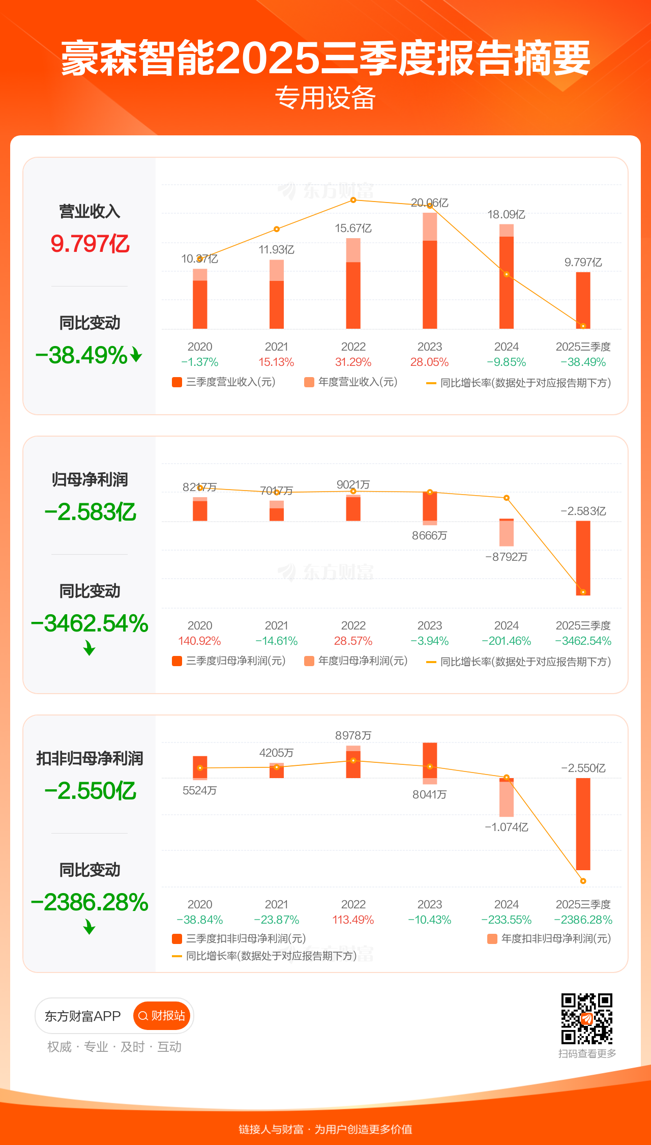 豪森智能10月31日发布2025年三季报显示,公司前三季实现营业收入9.80亿元,同比下滑38.49%;归母净利润-2.58亿元;扣非归母净利润-2.55亿元。