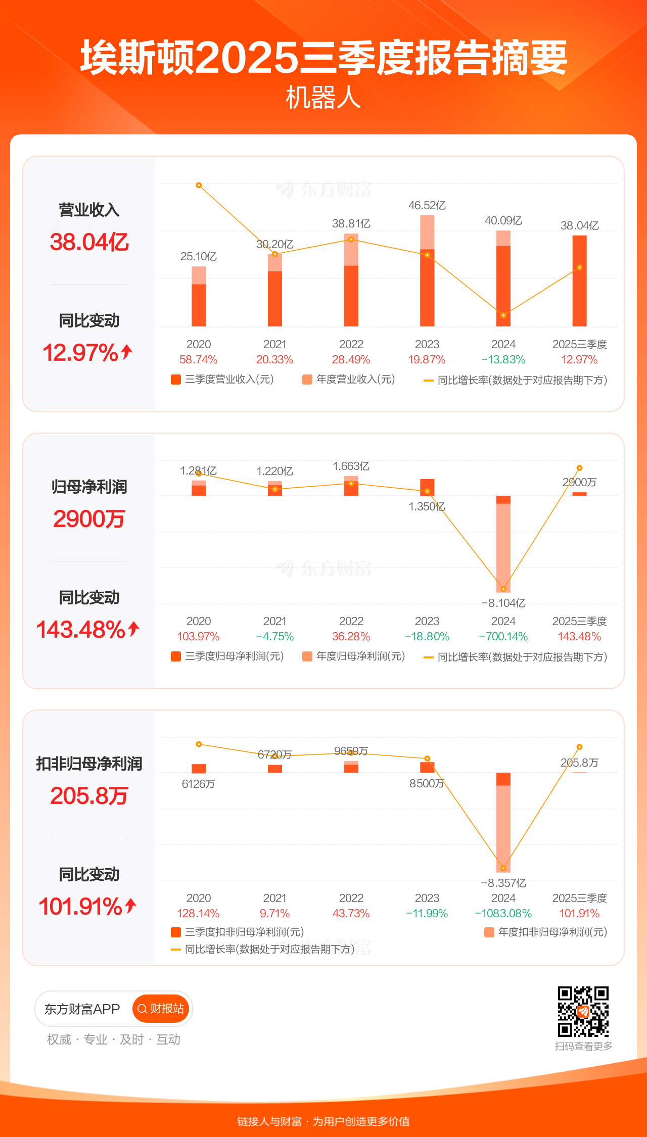 埃斯顿10月31日发布2025年三季报显示,公司前三季实现营业收入38.04亿元,同比增长12.97%;归母净利润2900.39万元,同比增长143.48%;扣非归母净利润205.85万元,同比增长101.91%
