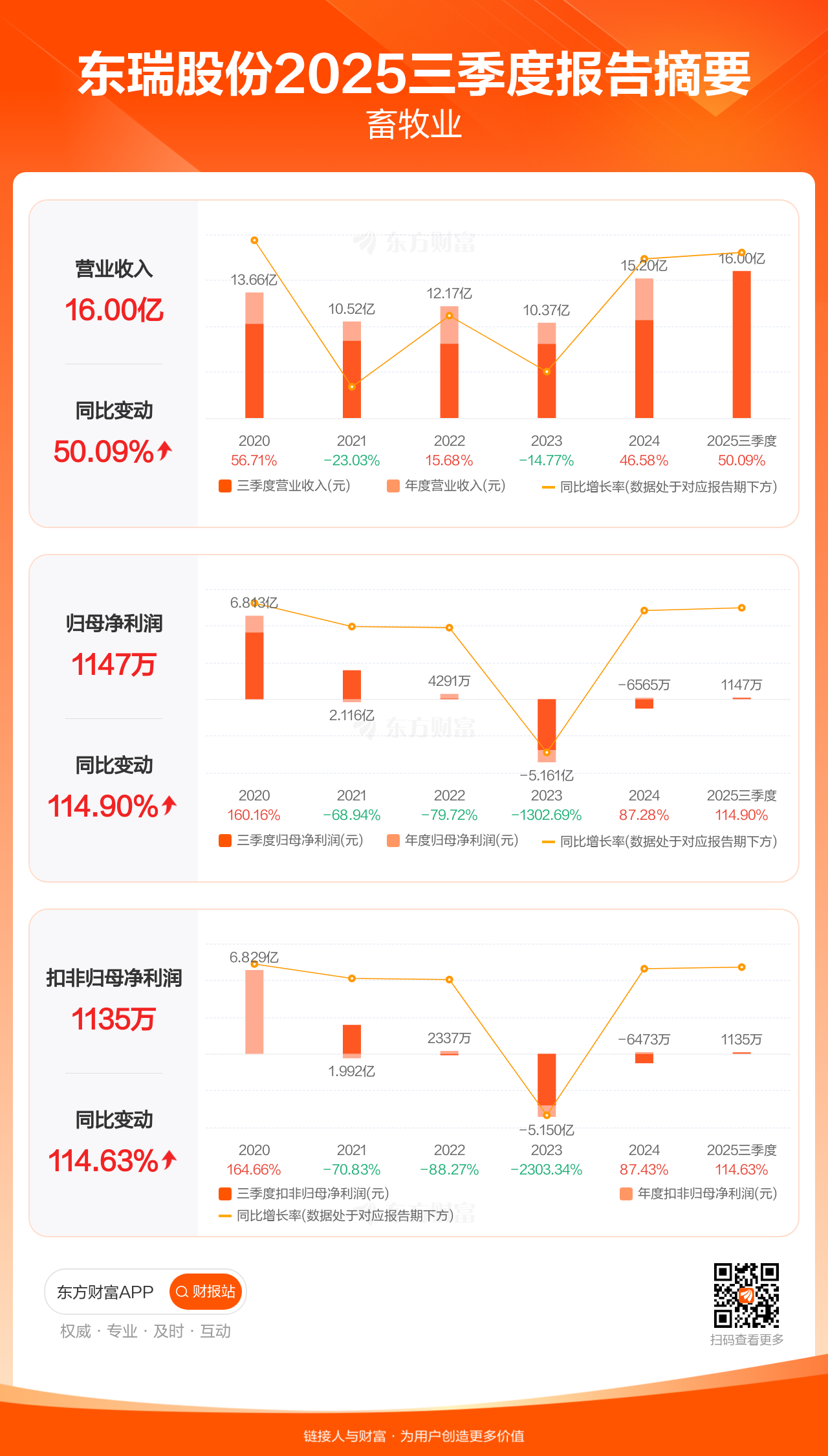 东瑞股份10月31日发布2025年三季报显示,公司前三季实现营业收入16.00亿元,同比增长50.09%;归母净利润1146.76万元,同比增长114.90%;扣非归母净利润1135.24万元,同比增长114.63%。