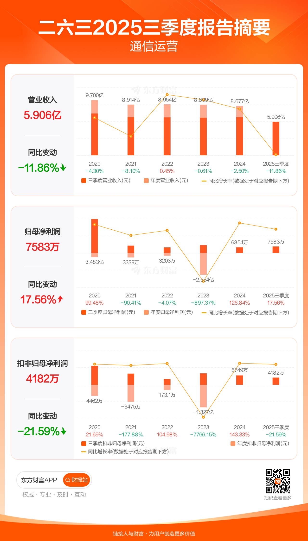 二六三10月31日发布2025年三季报显示,公司前三季实现营业收入5.91亿元,同比下滑11.86%;归母净利润7582.56万元,同比增长17.56%;扣非归母净利润4181.90万元,同比下滑21.59%。