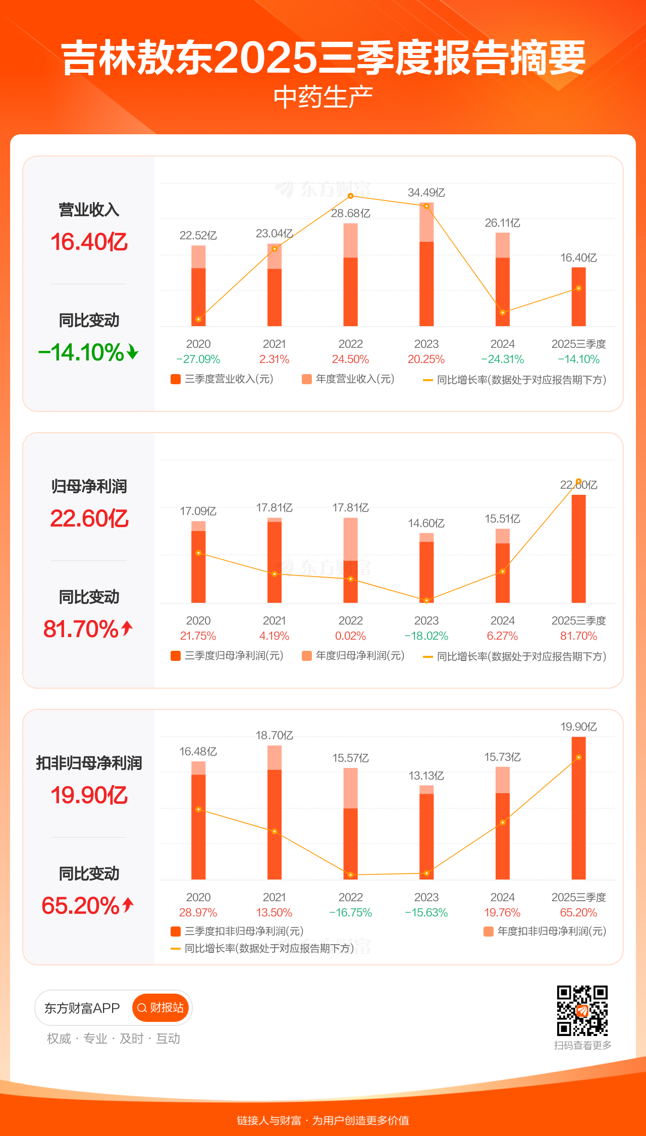 吉林敖东10月31日发布2025年三季报显示,公司前三季实现营业收入16.40亿元,同比下滑14.10%;归母净利润22.60亿元,同比增长81.70%;扣非归母净利润19.90亿元,同比增长65.20%。