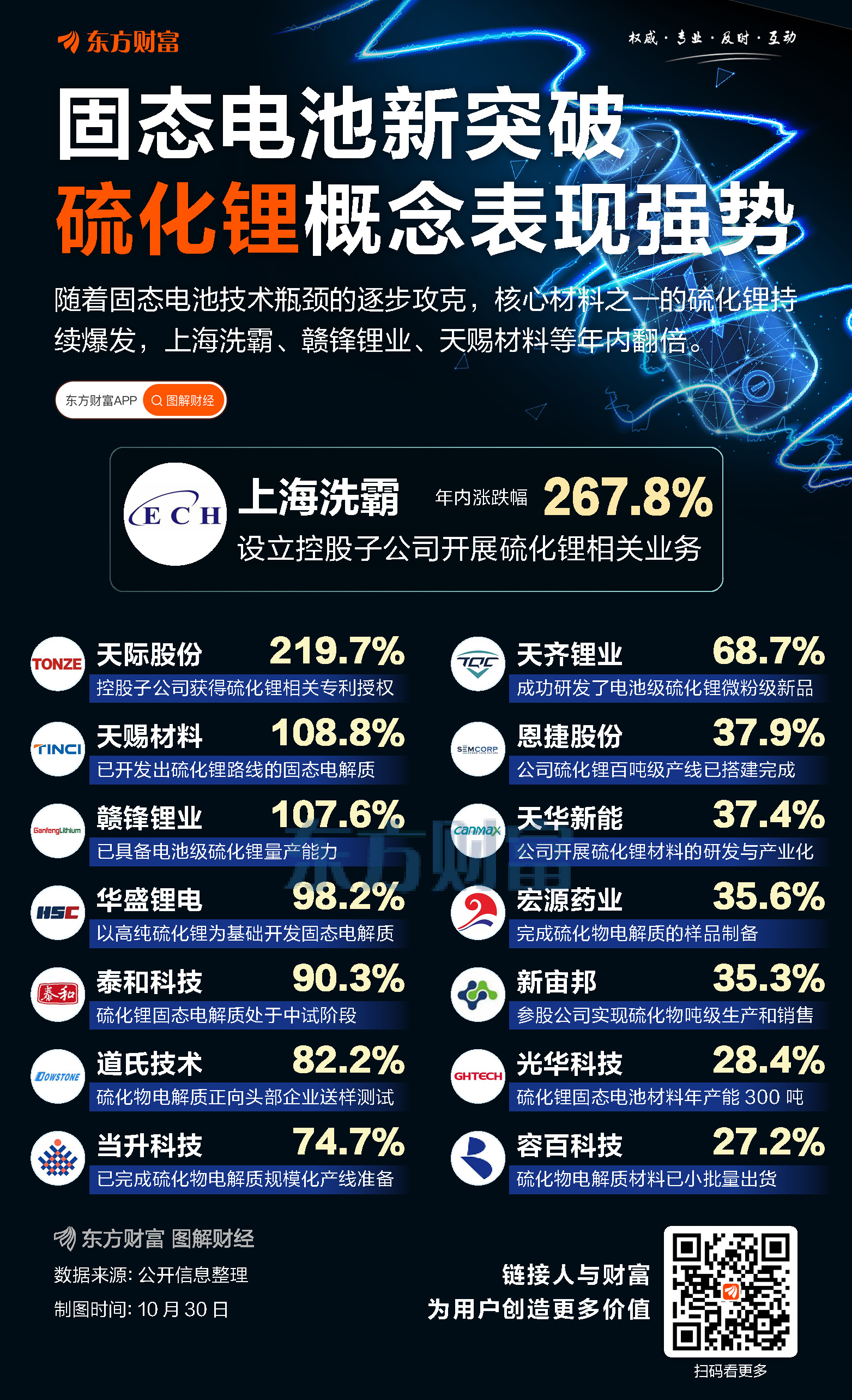 硫化锂板块10月30日表现强势,板块中天际股份涨停,天华新能大涨超10%,天齐锂业、华盛锂电、赣锋锂业也涨幅靠前。今年以来,上海洗霸(+267.78%)、天际股份(+219.73%)、天赐材料(+108.76%)、赣锋锂业(+107.63%)股价纷纷翻倍。