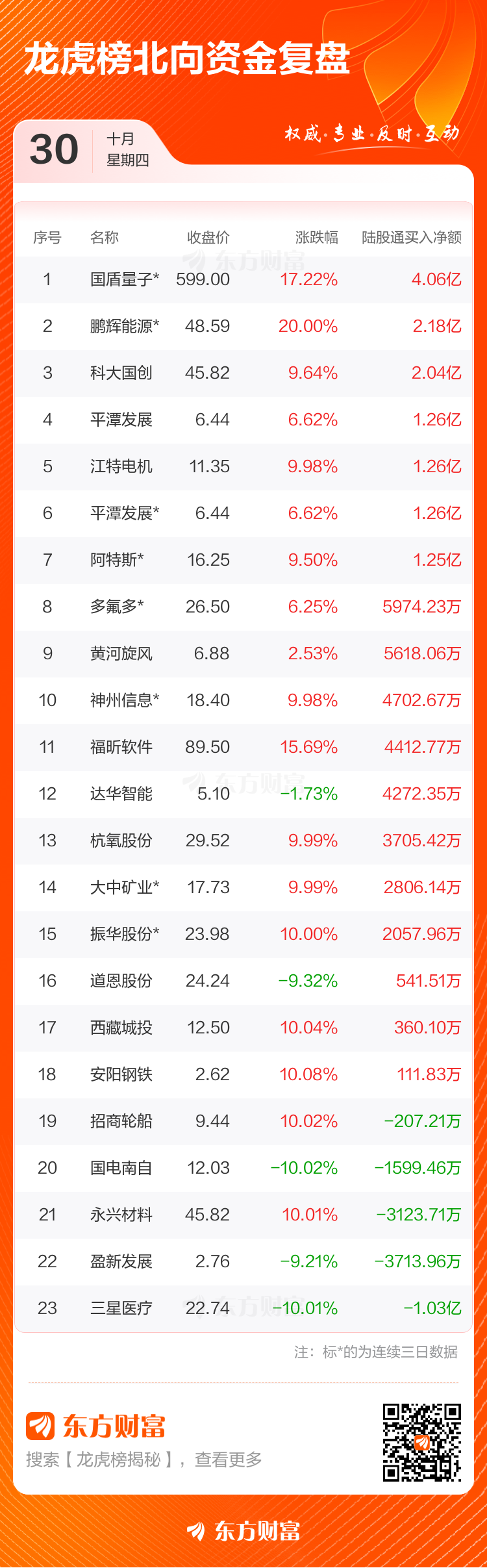 10月30日龙虎榜复盘:“湖里大道”8786.60万元净买入鹏辉能源