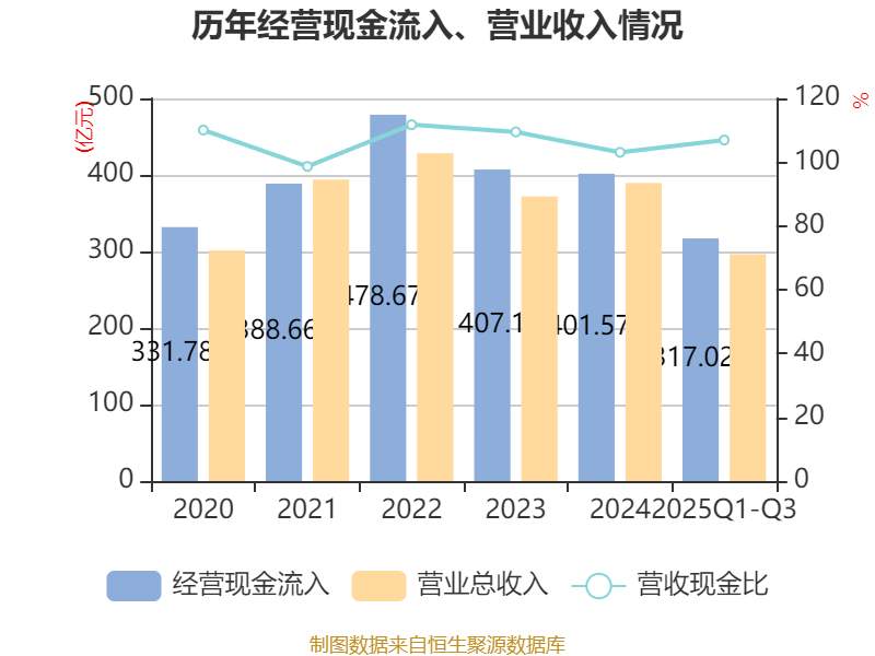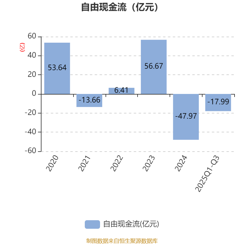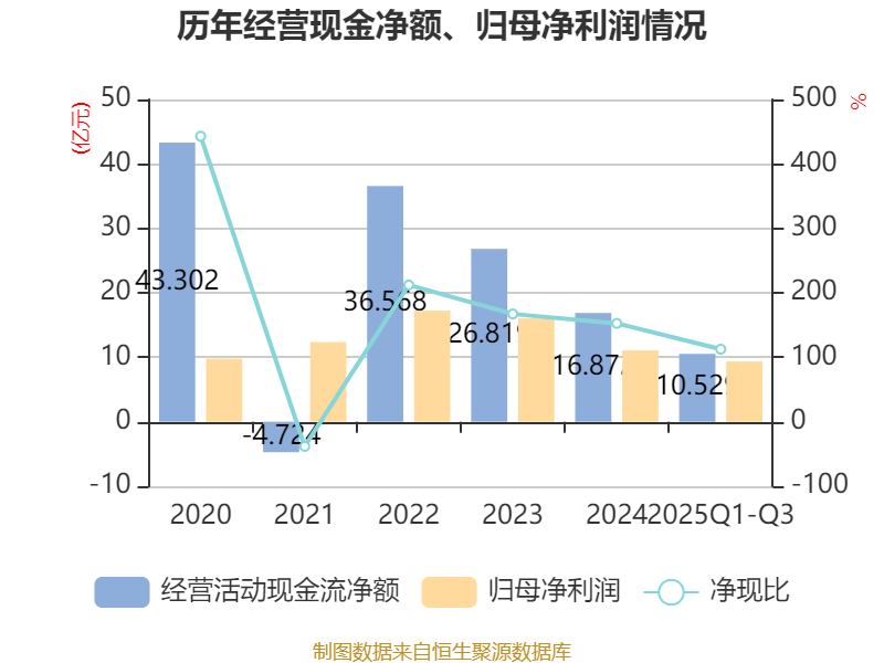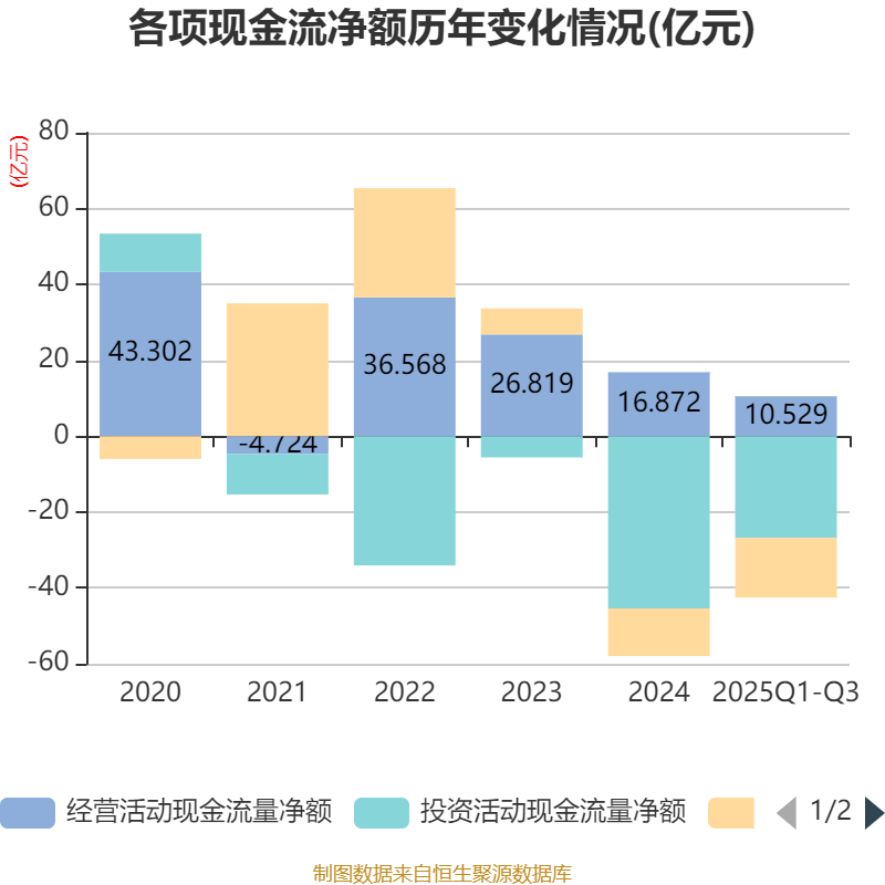 2025年前三季度,公司经营活动现金流净额为10.53亿元,同比增长28.75%;筹资活动现金流净额-15.73亿元,同比减少9.88亿元;投资活动现金流净额-26.81亿元,上年同期为-56.57亿元。