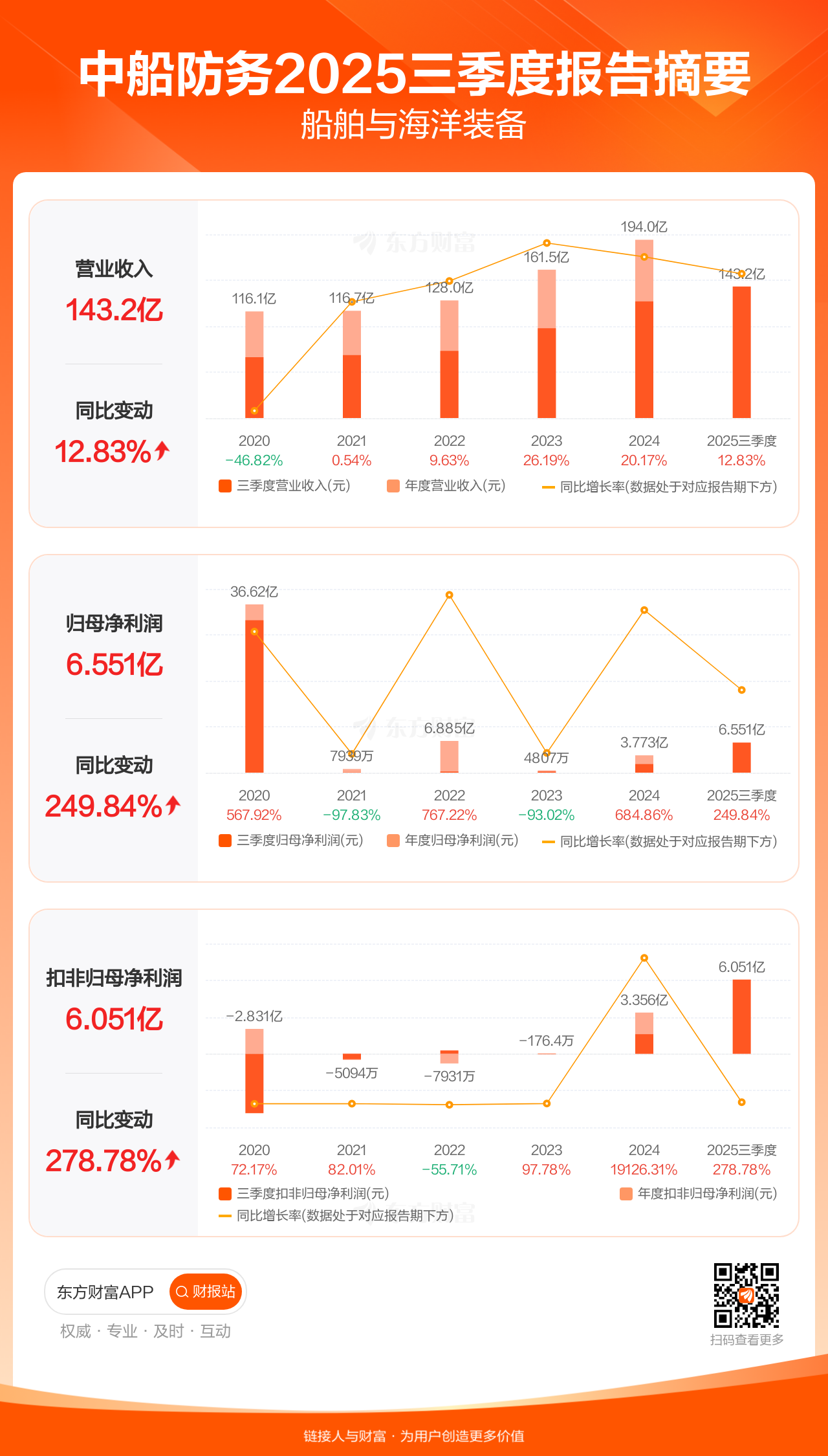 中船防务10月31日发布2025年三季报显示,公司前三季实现营业收入143.15亿元,同比增长12.83%;归母净利润6.55亿元,同比增长249.84%;扣非归母净利润6.05亿元,同比增长278.78%。