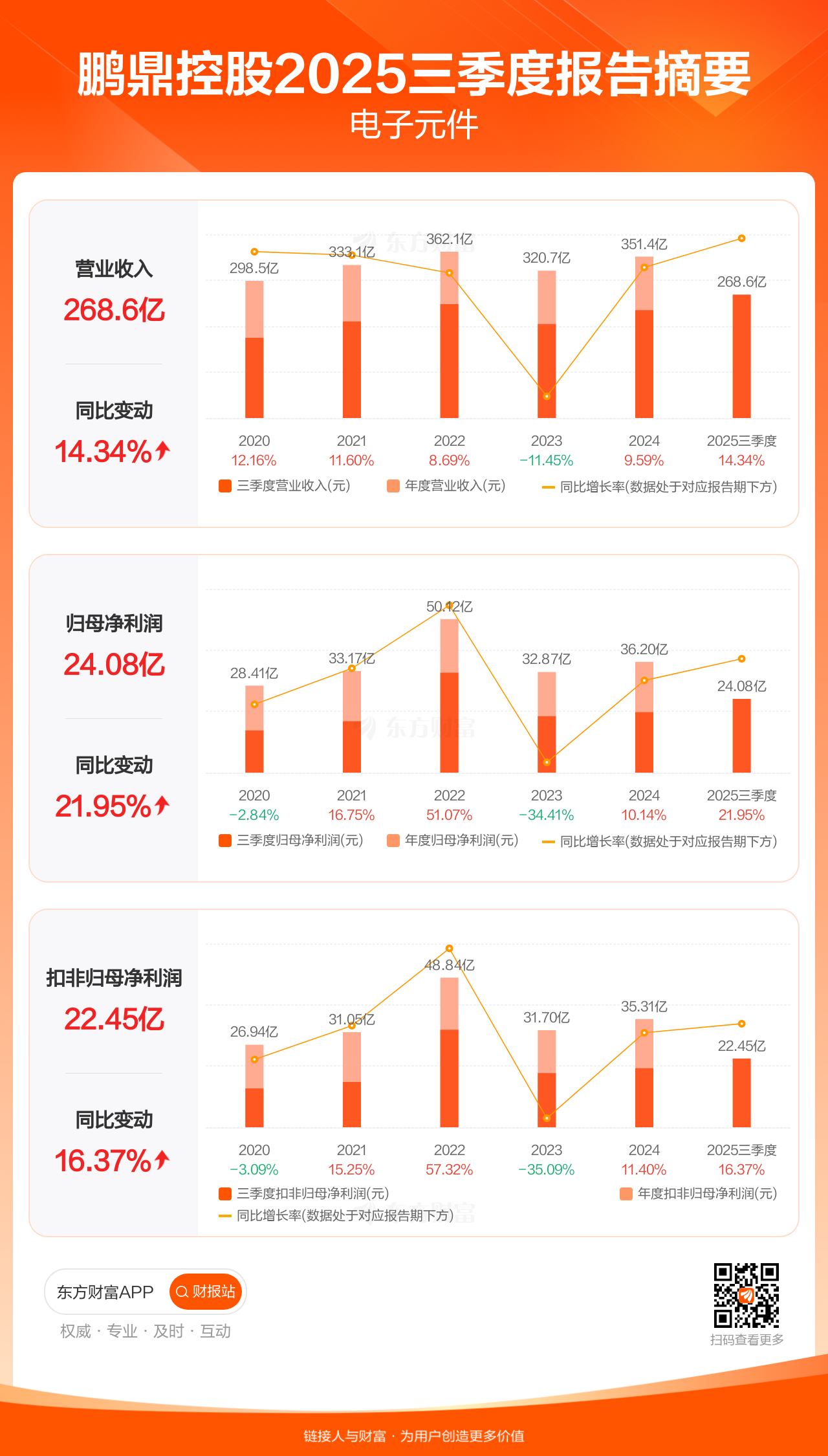 鹏鼎控股10月31日发布2025年三季报显示,公司前三季实现营业收入268.55亿元,同比增长14.34%;归母净利润24.08亿元,同比增长21.95%;扣非归母净利润22.45亿元,同比增长16.37%。