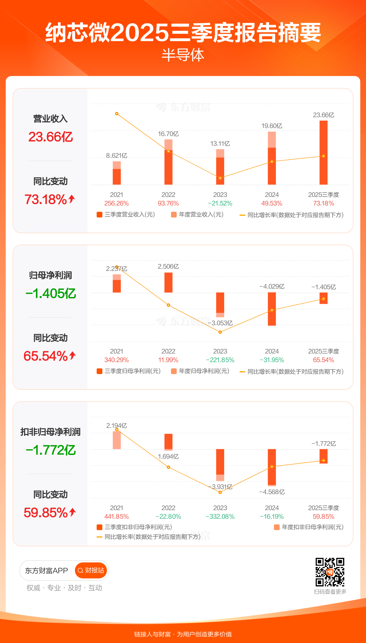 纳芯微10月31日发布2025年三季报显示,公司前三季实现营业收入23.66亿元,同比增长73.18%;归母净利润-1.40亿元;扣非归母净利润-1.77亿元