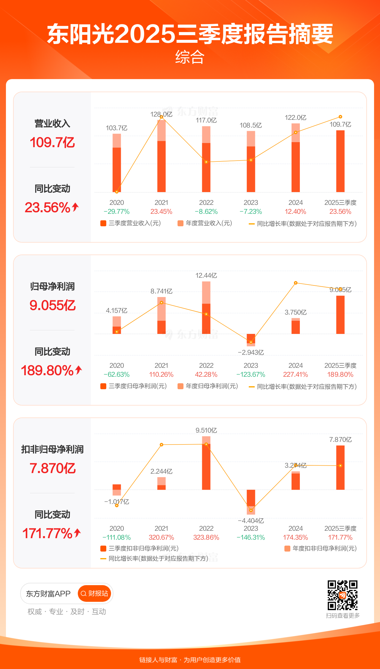 东阳光10月28日发布2025年三季报显示,公司前三季实现营业收入109.70亿元,同比增长23.56%;归母净利润9.06亿元,同比增长189.80%;扣非归母净利润7.87亿元,同比增长171.77%。