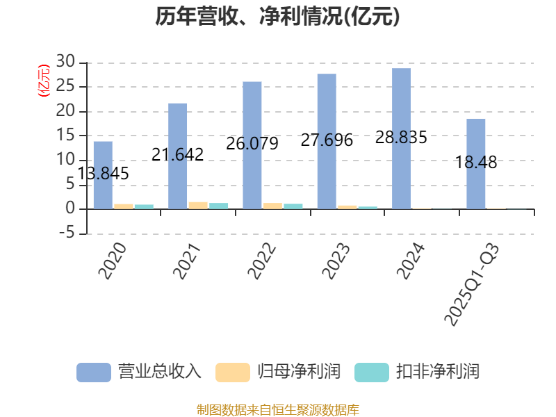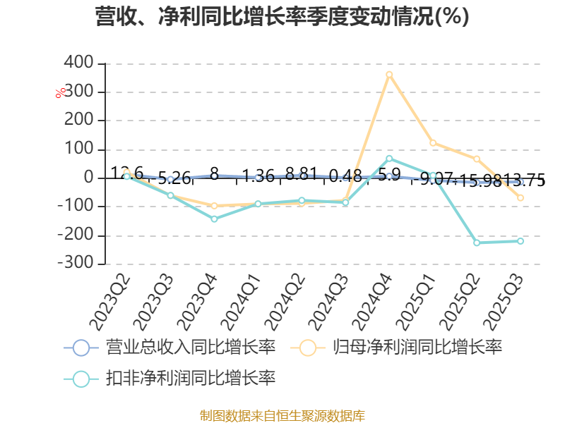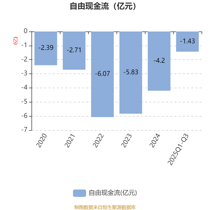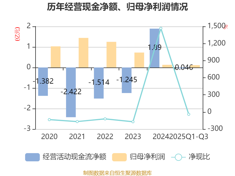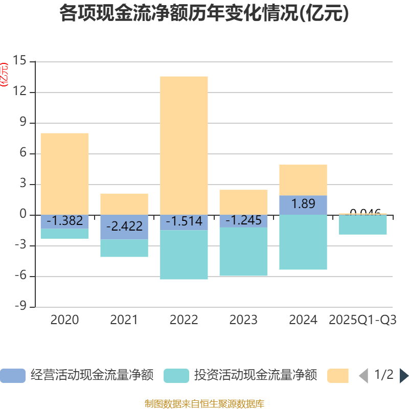 2025年前三季度,公司经营活动现金流净额为-459.64万元,同比增加863.5万元;筹资活动现金流净额1339.33万元,同比减少3.29亿元;投资活动现金流净额-1.89亿元,上年同期为-4.16亿元。