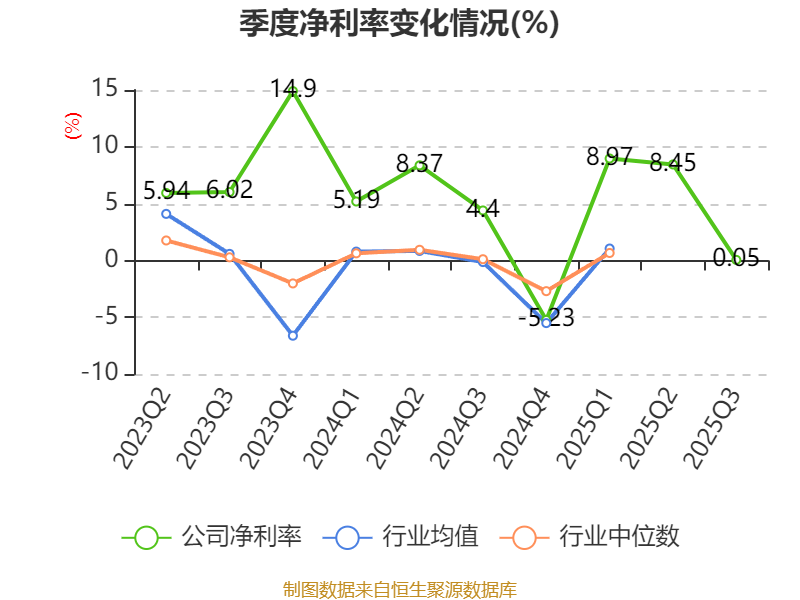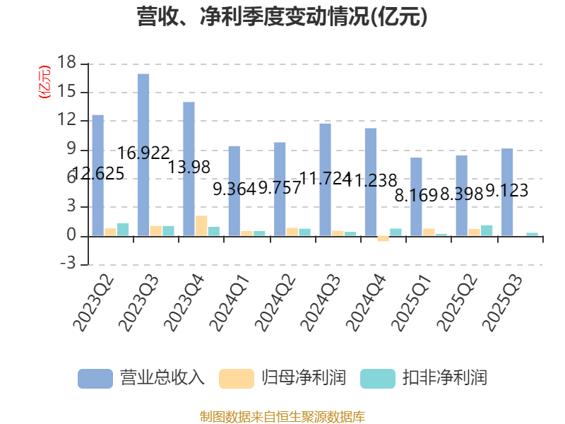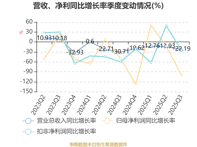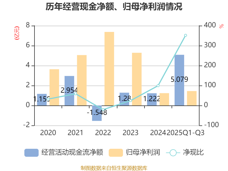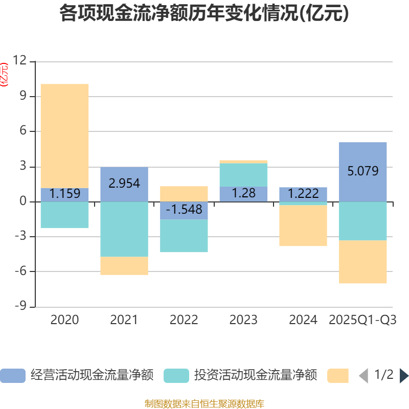 2025年前三季度,公司经营活动现金流净额为5.08亿元,同比增加6.97亿元;筹资活动现金流净额-3.67亿元,同比增加5098.94万元;投资活动现金流净额-3.33亿元,上年同期为1529.54万元。