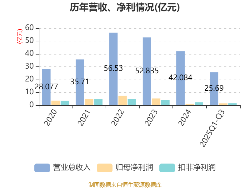 中证智能财讯三人行(605168)10月31日披露2025年第三季度报告。前三季度公司实现营业总收入25.69亿元,同比下降16.72%;归母净利润1.44亿元,同比下降20.48%;扣非净利润1.56亿元,同比下降3.09%;经营活动产生的现金流量净额为5.08亿元,上年同期为-1.89亿元;报告期内,三人行基本每股收益为0.69元,加权平均净资产收益率为5.37%。
