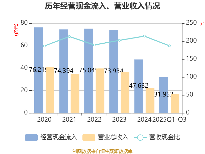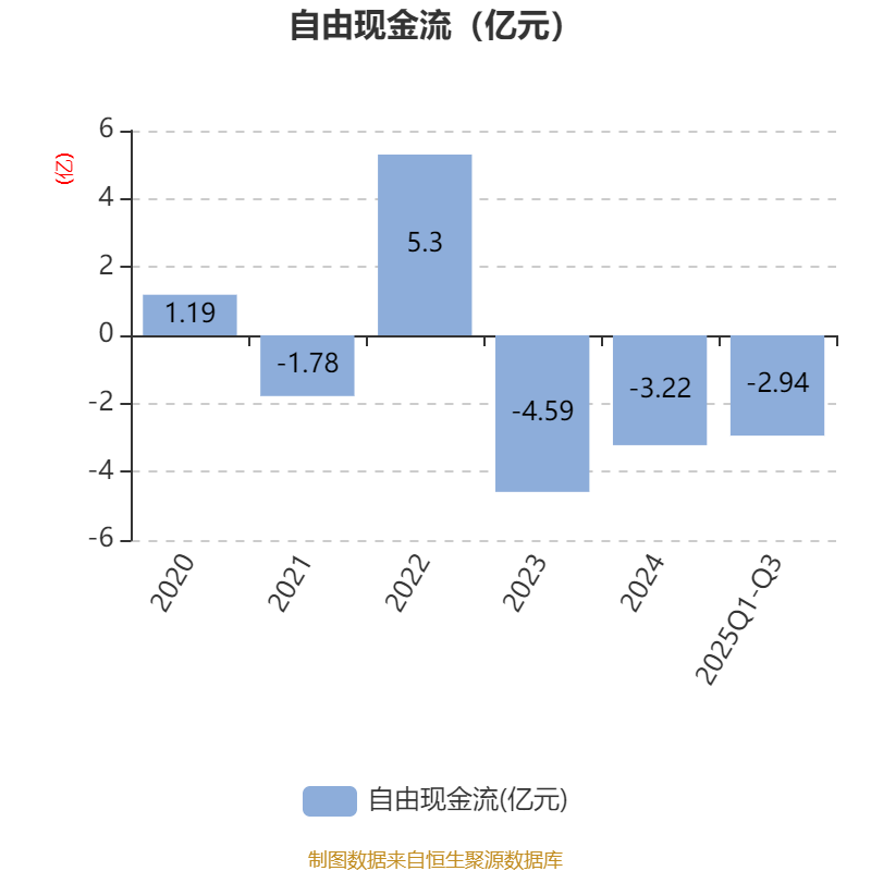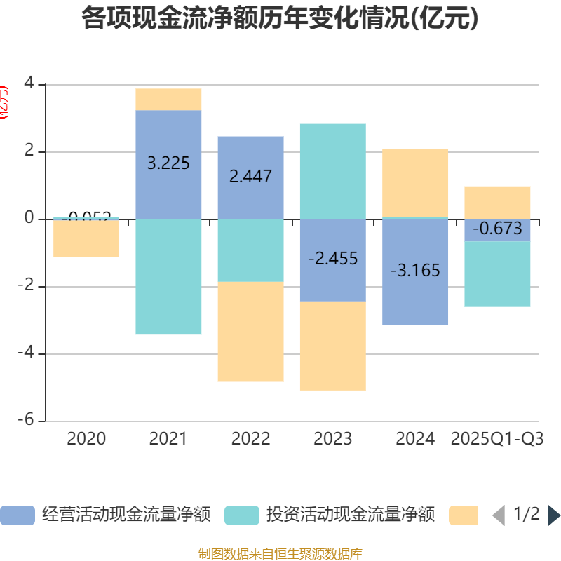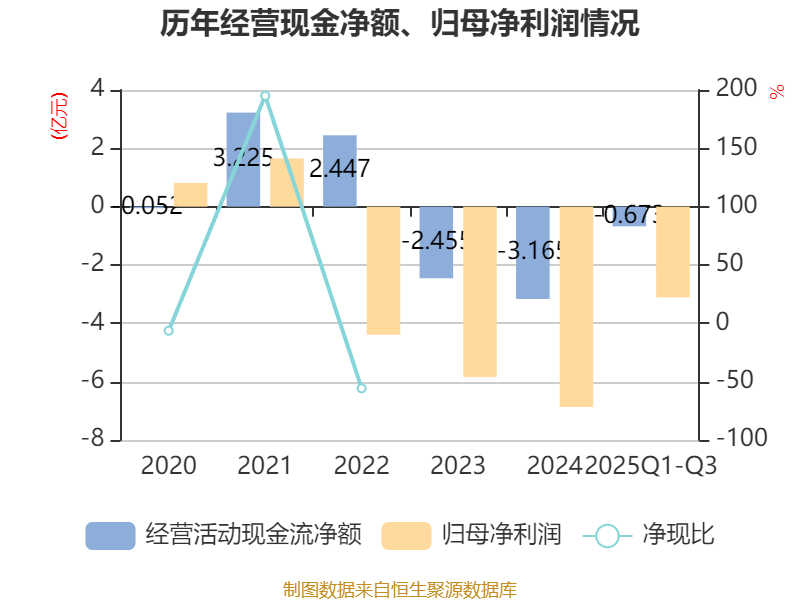 2025年前三季度,公司经营活动现金流净额为-6725.31万元,同比增加1.88亿元;筹资活动现金流净额9644.58万元,同比增加1.03亿元;投资活动现金流净额-1.94亿元,上年同期为259.38万元。