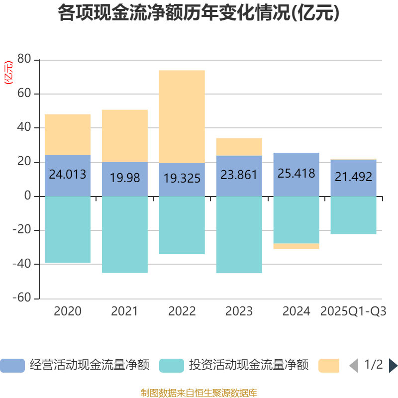 2025年前三季度,公司经营活动现金流净额为21.49亿元,同比下降20.73%;筹资活动现金流净额4287.08万元,同比增加9.81亿元;投资活动现金流净额-22.25亿元,上年同期为-24.22亿元。