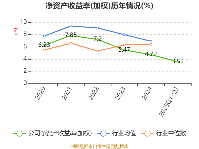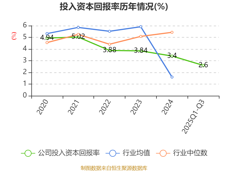 盈利能力方面, 2025年前三季度公司加权平均净资产收益率为3.55%,同比下降0.46个百分点。公司2025年前三季度投入资本回报率为2.6%,较上年同期下降0.24个百分点。