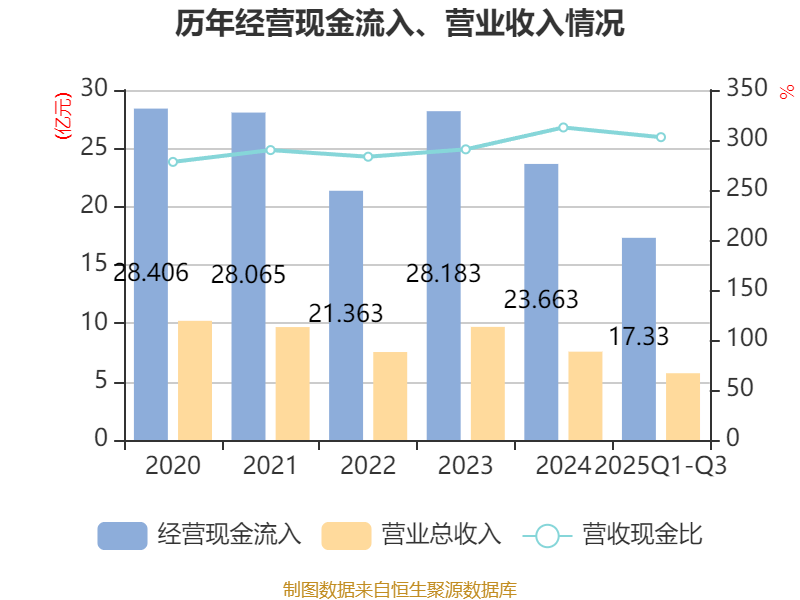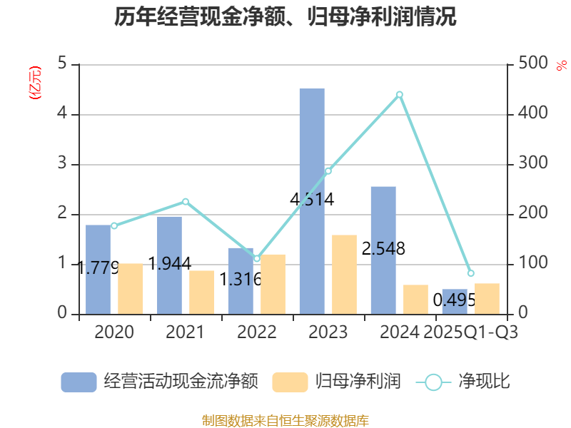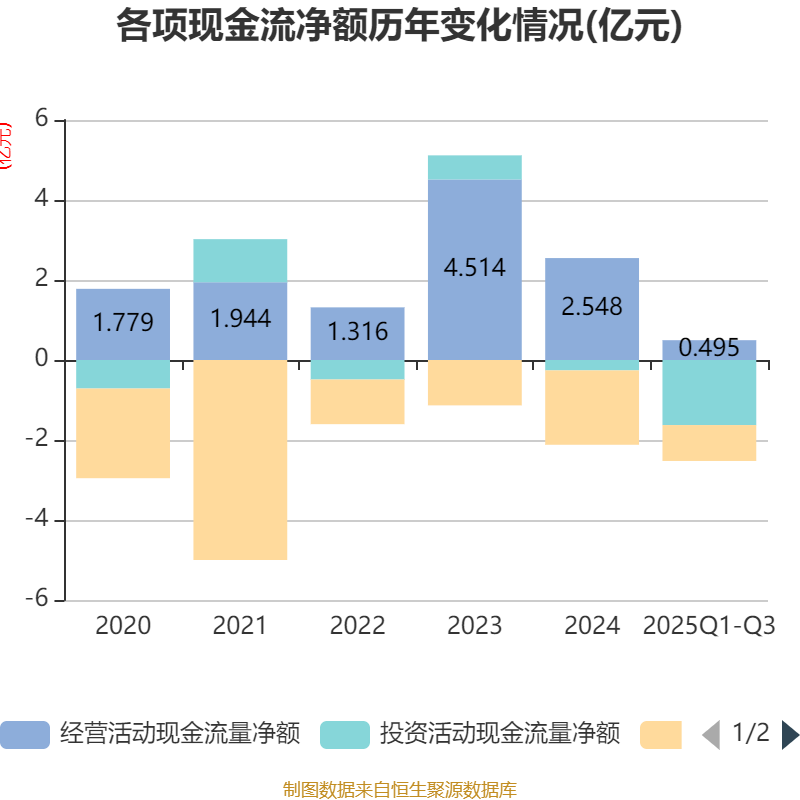 2025年前三季度,公司经营活动现金流净额为4954.96万元,同比下降49.02%;筹资活动现金流净额-8968.39万元,同比增加7657.75万元;投资活动现金流净额-1.63亿元,上年同期为6595.64万元。