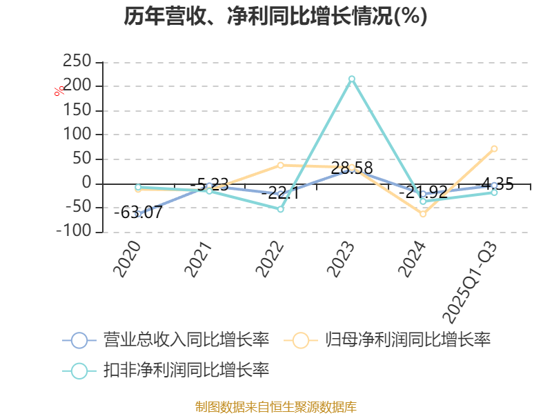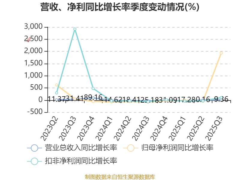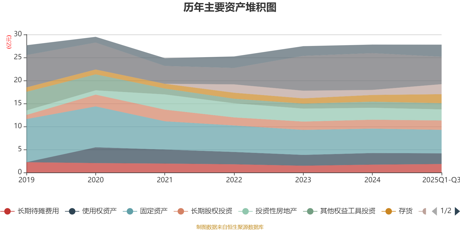 资产重大变化方面,截至2025年三季度末,公司货币资金较上年末减少25.37%,占公司总资产比重下降7.29个百分点;交易性金融资产合计较上年末增加98.4%,占公司总资产比重上升3.91个百分点;存货较上年末增加34.01%,占公司总资产比重上升1.79个百分点;使用权资产较上年末减少8.1%,占公司总资产比重下降0.73个百分点。