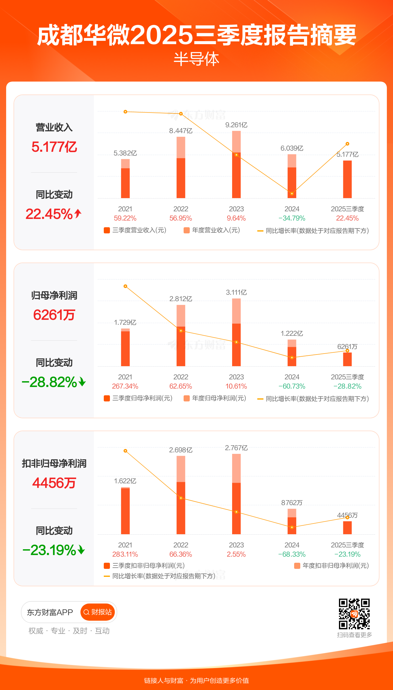 成都华微10月31日发布2025年三季报显示,公司前三季实现营业收入5.18亿元,同比增长22.45%;归母净利润6260.51万元,同比下滑28.82%;扣非归母净利润4455.73万元,同比下滑23.19%。