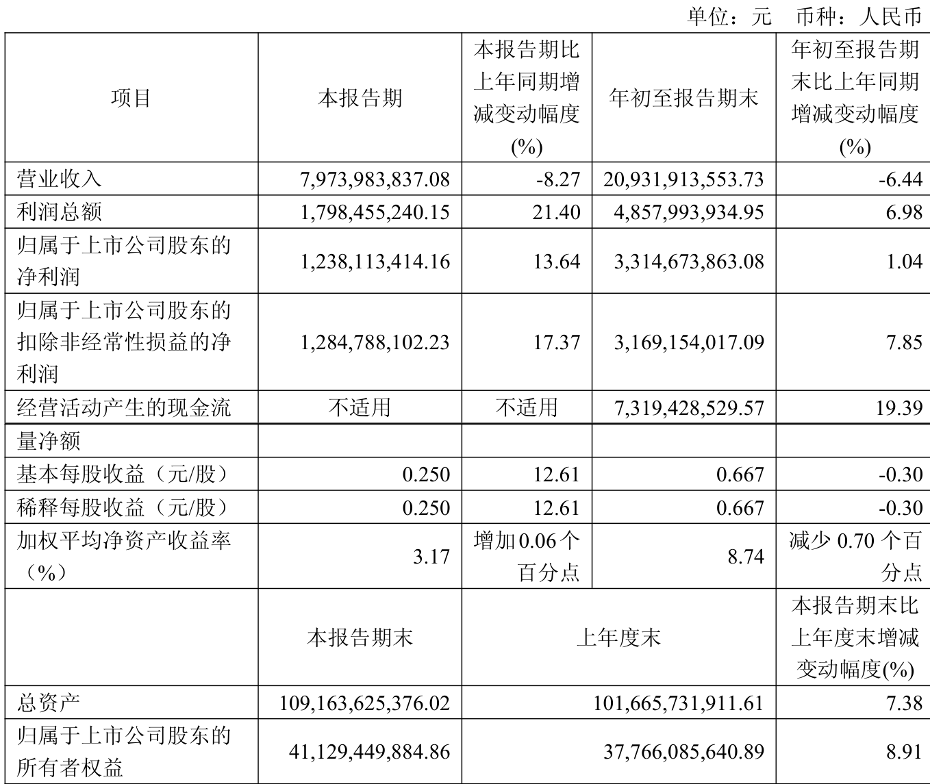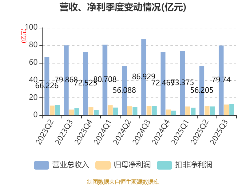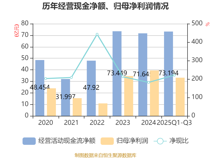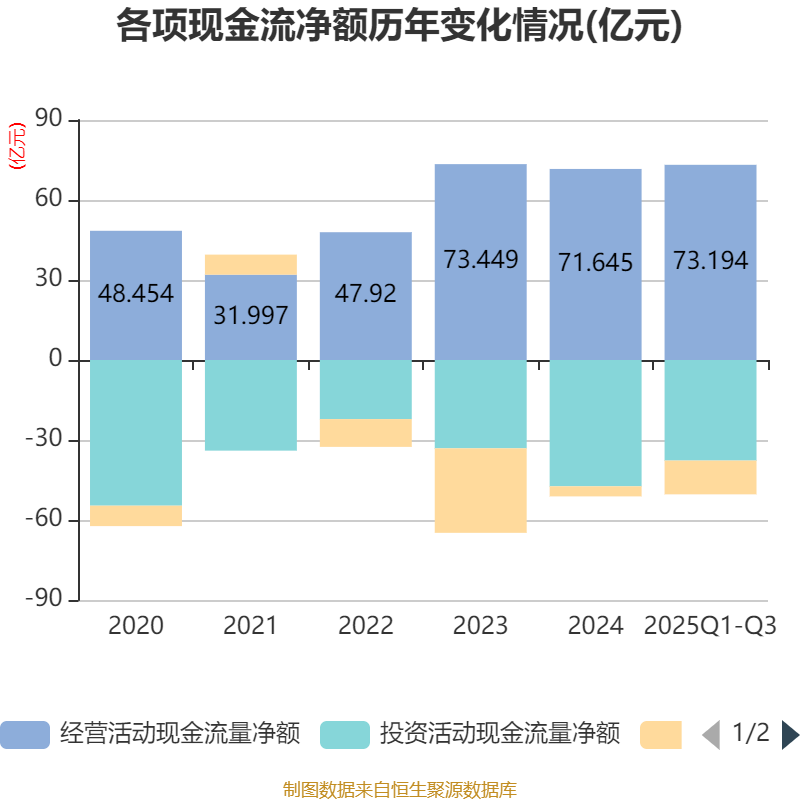 2025年前三季度,公司经营活动现金流净额为73.19亿元,同比增长19.39%;筹资活动现金流净额-12.67亿元,同比减少12.13亿元;投资活动现金流净额-37.71亿元,上年同期为-34.58亿元。