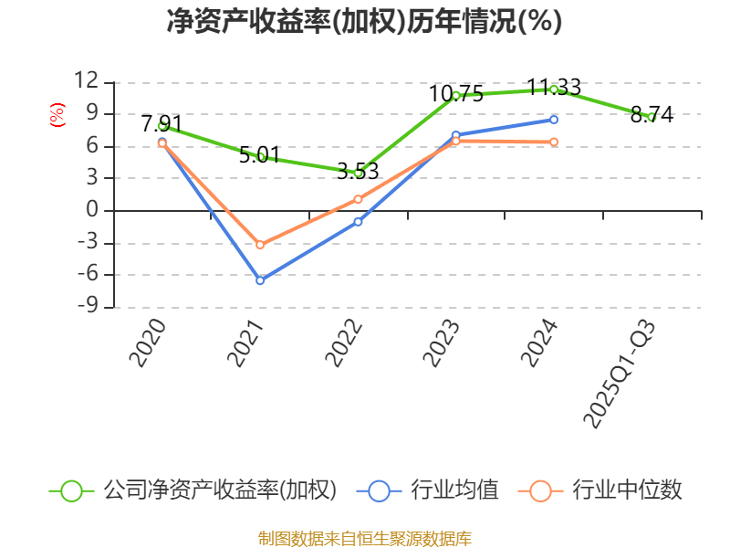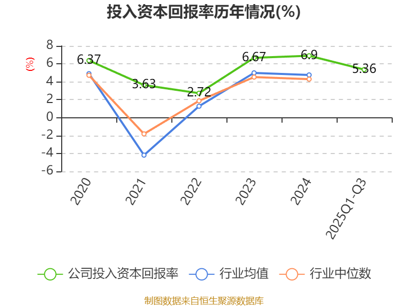盈利能力方面, 2025年前三季度公司加权平均净资产收益率为8.74%,同比下降0.7个百分点。公司2025年前三季度投入资本回报率为5.36%,较上年同期下降0.35个百分点。