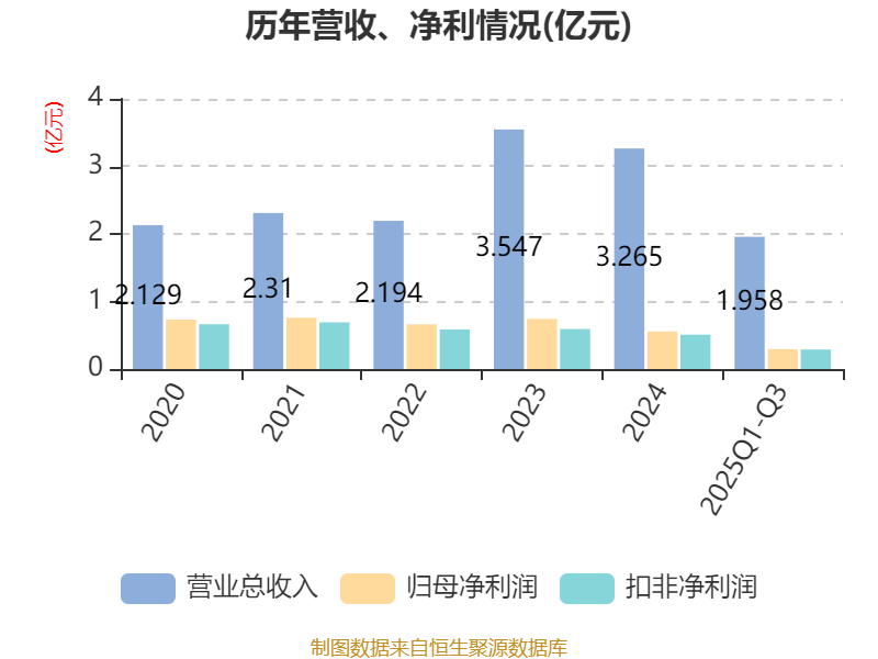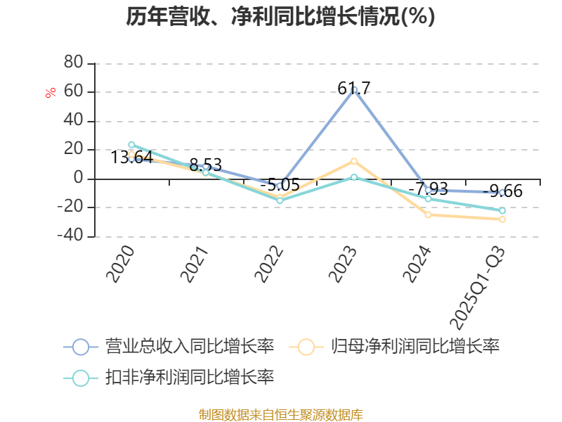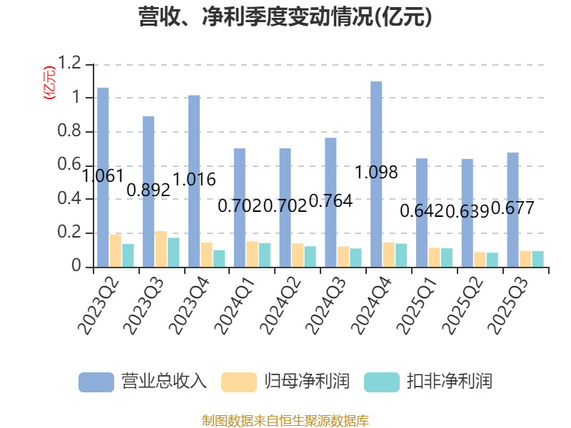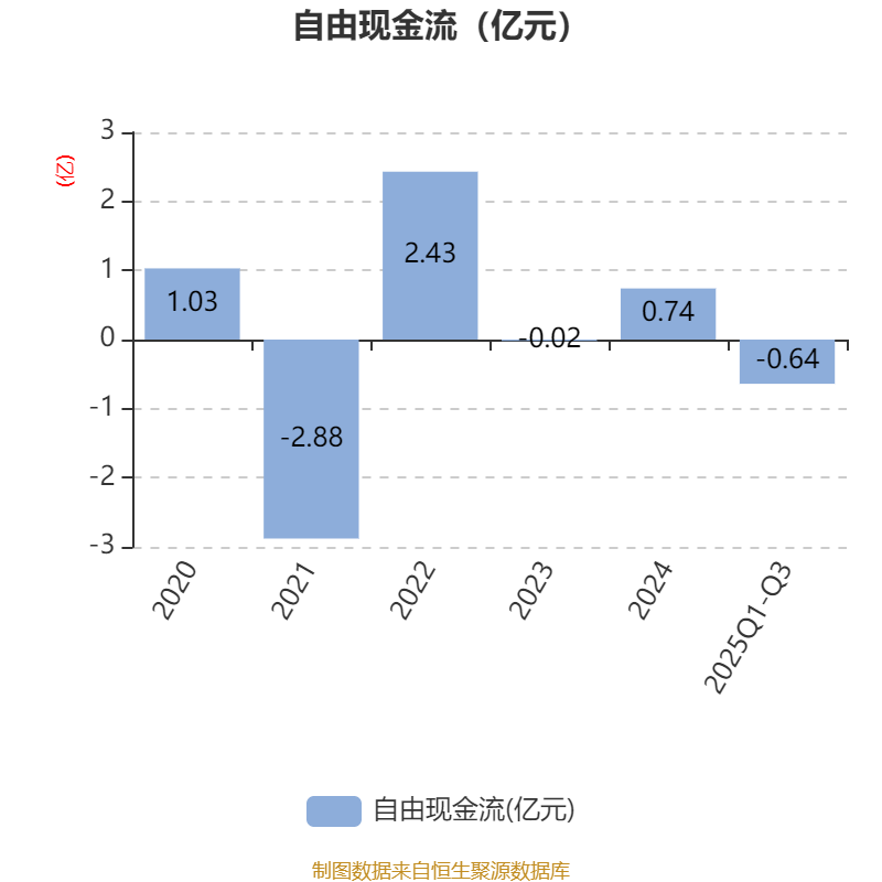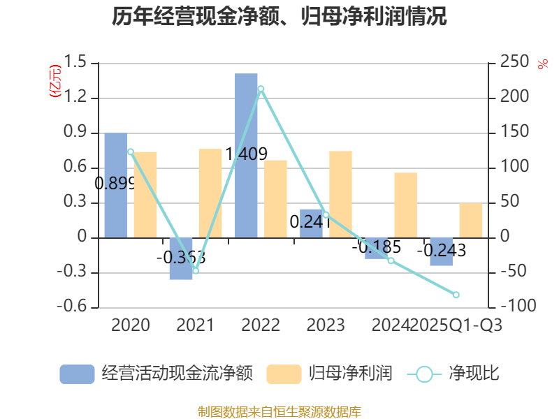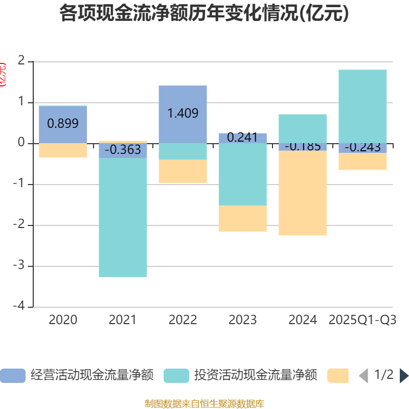 2025年前三季度,公司经营活动现金流净额为-2425.87万元,同比减少861.66万元;筹资活动现金流净额-4096.98万元,同比增加1.61亿元;投资活动现金流净额1.8亿元,上年同期为1.04亿元。