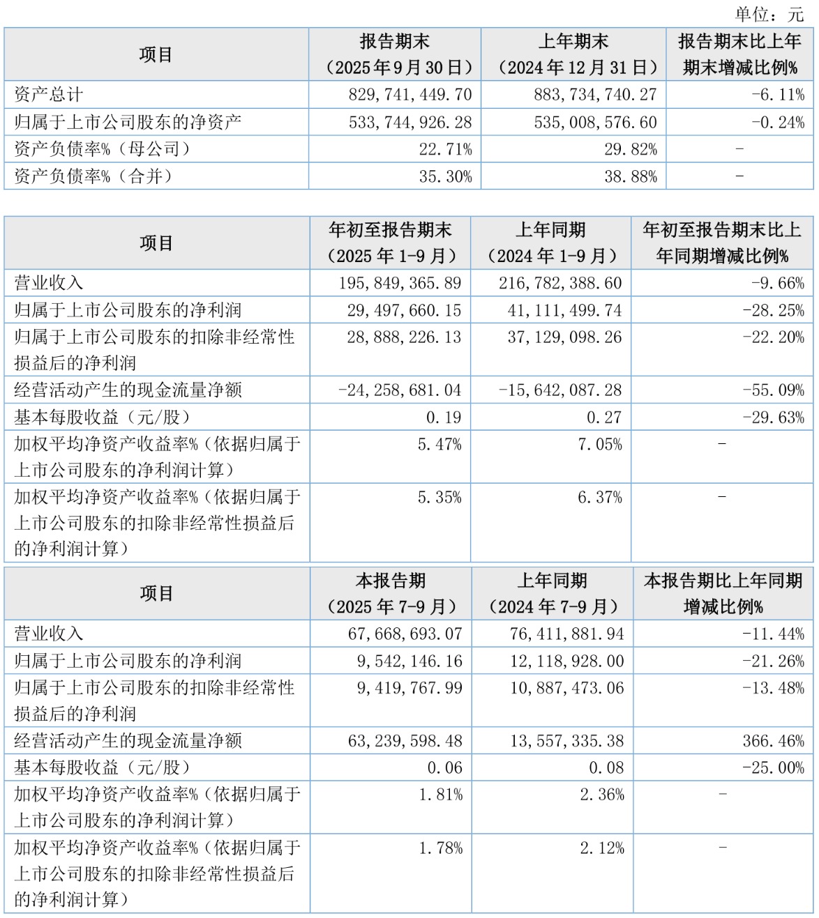 负债重大变化方面,截至2025年三季度末,公司其他应付款(含利息和股利)较上年末减少12.67%,占公司总资产比重下降2.15个百分点;应付票据及应付账款较上年末减少43.86%,占公司总资产比重下降1个百分点;应付职工薪酬较上年末减少38.99%,占公司总资产比重下降0.72个百分点;应交税费较上年末减少49.61%,占公司总资产比重下降0.67个百分点。