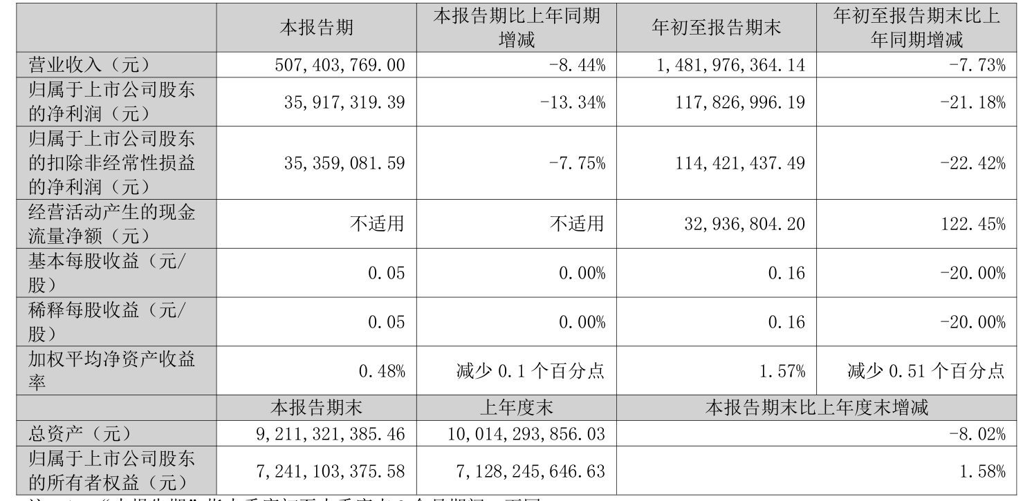 中证智能财讯瑞泰新材(301238)10月31日披露2025年第三季度报告。前三季度公司实现营业总收入14.82亿元,同比下降7.73%;归母净利润1.18亿元,同比下降21.18%;扣非净利润1.14亿元,同比下降22.42%;经营活动产生的现金流量净额为3293.68万元,上年同期为-1.47亿元;报告期内,瑞泰新材基本每股收益为0.16元,加权平均净资产收益率为1.57%。公司2025年中期利润分配预案为:拟向全体股东每10股派现1元(含税)。