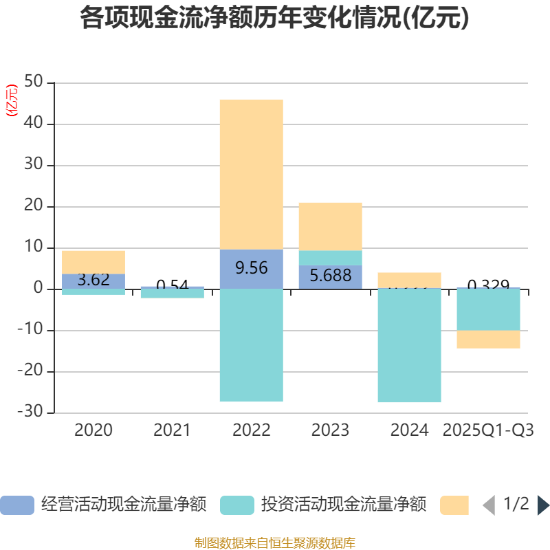 2025年前三季度,公司经营活动现金流净额为3293.68万元,同比增加1.8亿元;筹资活动现金流净额-4.34亿元,同比减少6.8亿元;投资活动现金流净额-10.12亿元,上年同期为-36.68亿元。