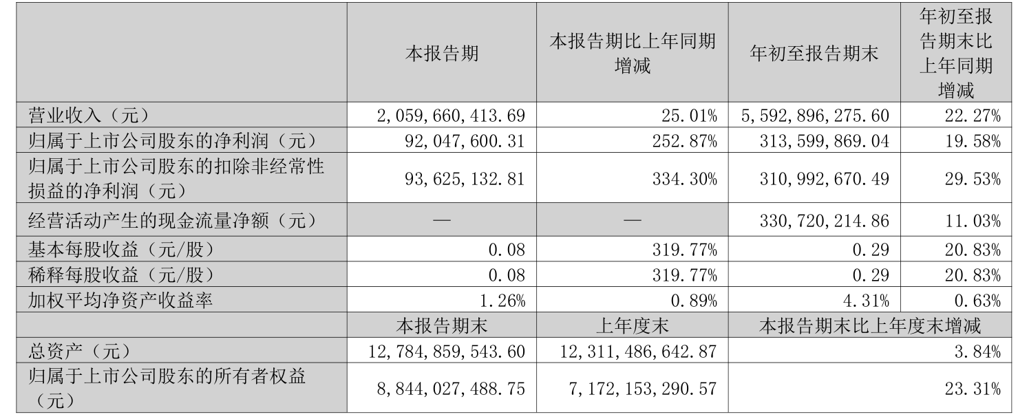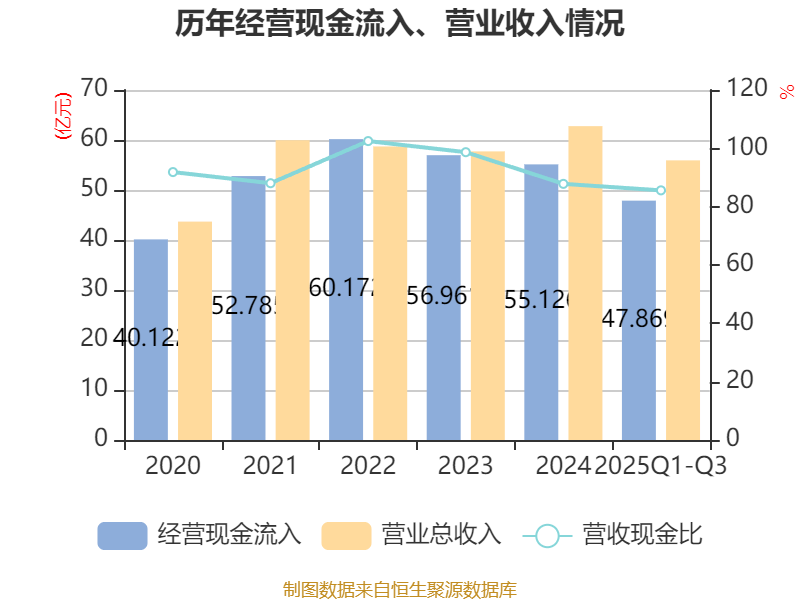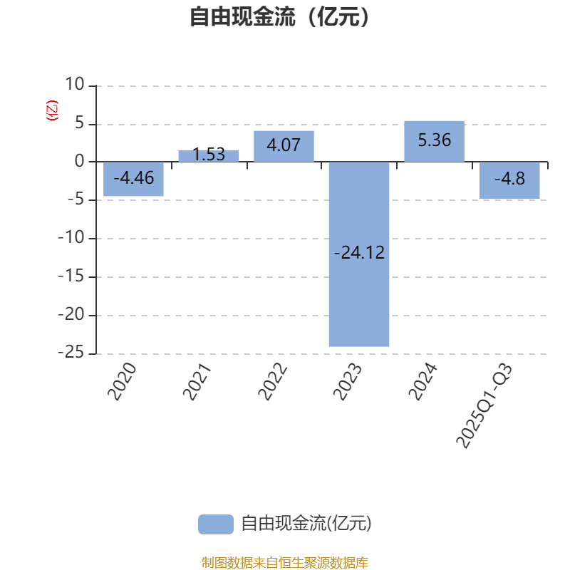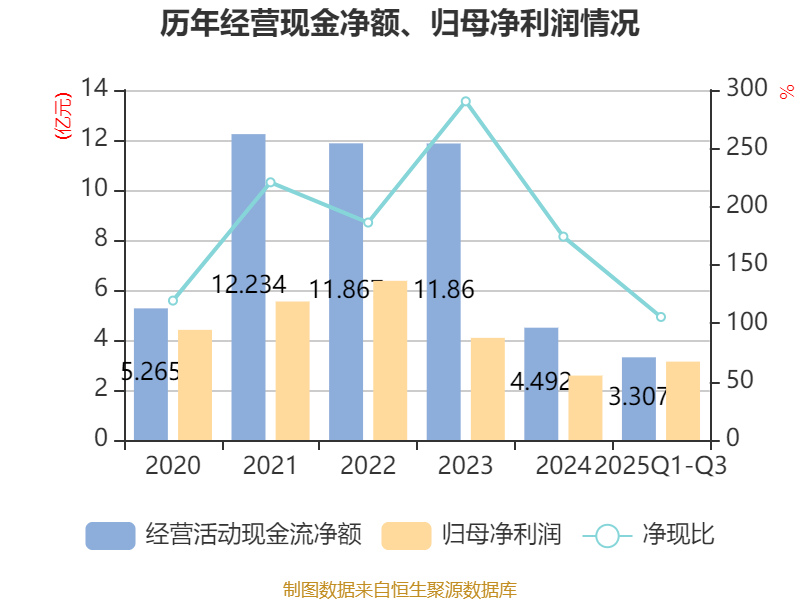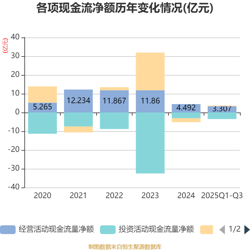 2025年前三季度,公司经营活动现金流净额为3.31亿元,同比增长11.03%;筹资活动现金流净额3555.72万元,同比减少2081.5万元;投资活动现金流净额-3.49亿元,上年同期为-1.21亿元。