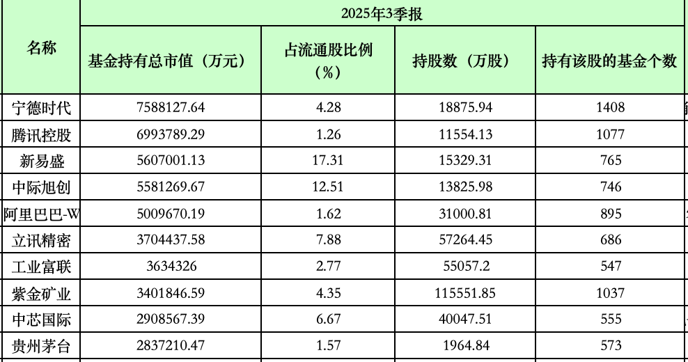 天相投顾数据显示,截至三季度末,纳入统计的5278只积极投资偏股型基金的前十大重仓股为宁德时代(758.81亿元)、腾讯控股(699.38亿元)、新易盛(560.70亿元)、中际旭创(558.13亿元)、阿里巴巴-W(500.97亿元)、立讯精密(370.44亿元)、工业富联(363.43亿元)、紫金矿业(340.18亿元)、中芯国际(290.86亿元)、贵州茅台(283.72亿元)。