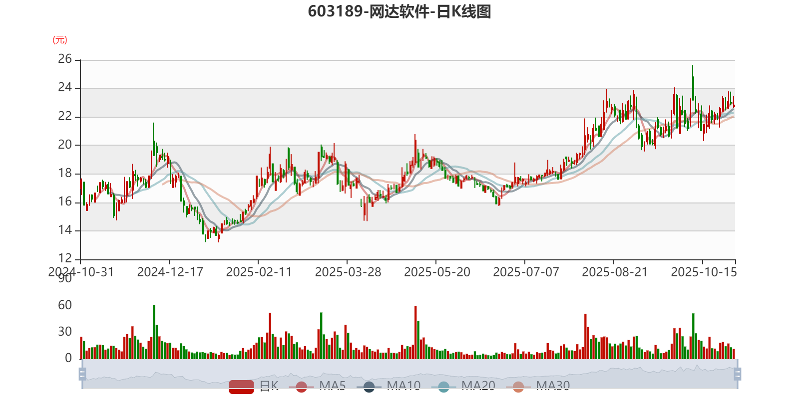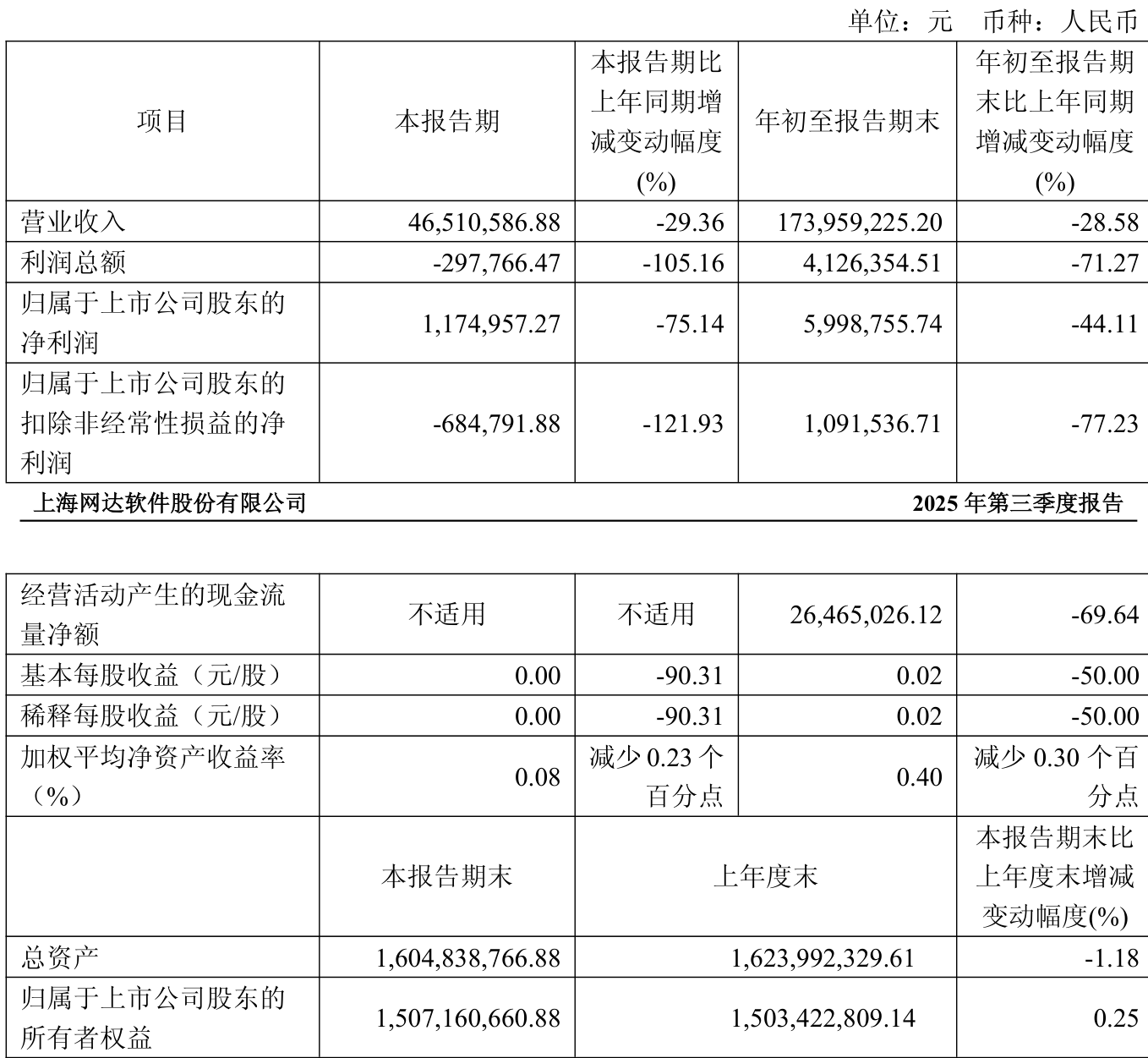 中证智能财讯网达软件(603189)10月31日披露2025年第三季度报告。前三季度公司实现营业总收入1.74亿元,同比下降28.58%;归母净利润599.88万元,同比下降44.11%;扣非净利润109.15万元,同比下降77.23%;经营活动产生的现金流量净额为2646.5万元,同比下降69.64%;报告期内,网达软件基本每股收益为0.02元,加权平均净资产收益率为0.40%。