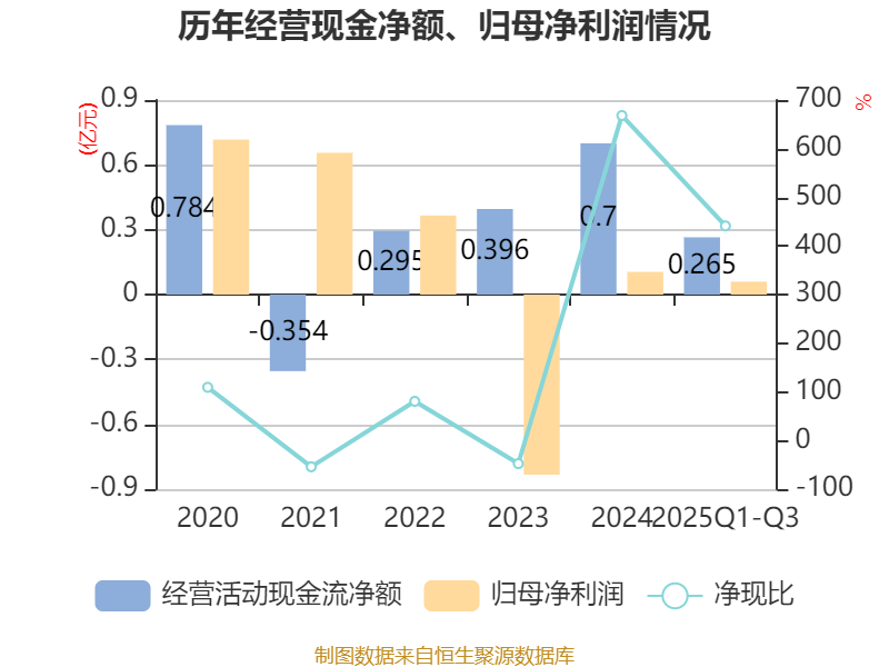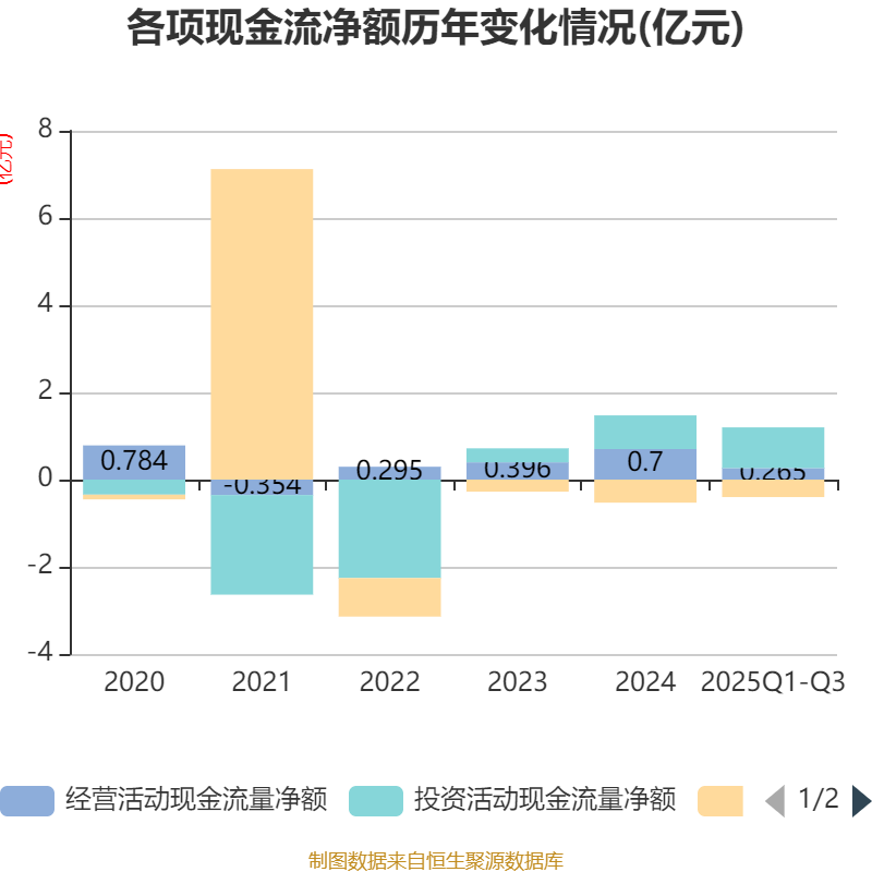 2025年前三季度,公司经营活动现金流净额为2646.5万元,同比下降69.64%;筹资活动现金流净额-4005.13万元,同比增加1435.25万元;投资活动现金流净额9326.13万元,上年同期为3362.8万元。