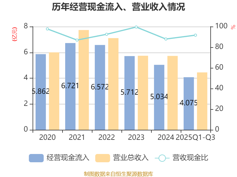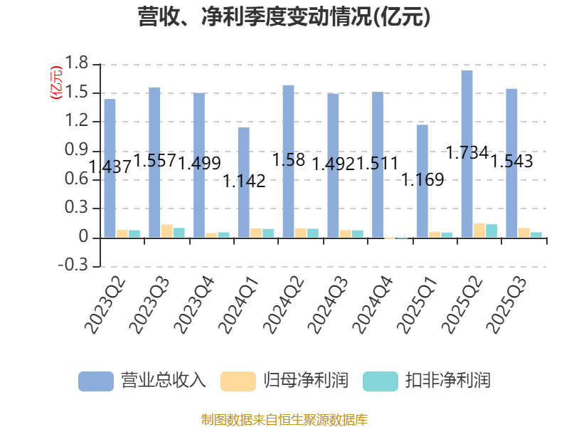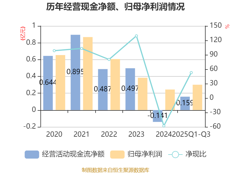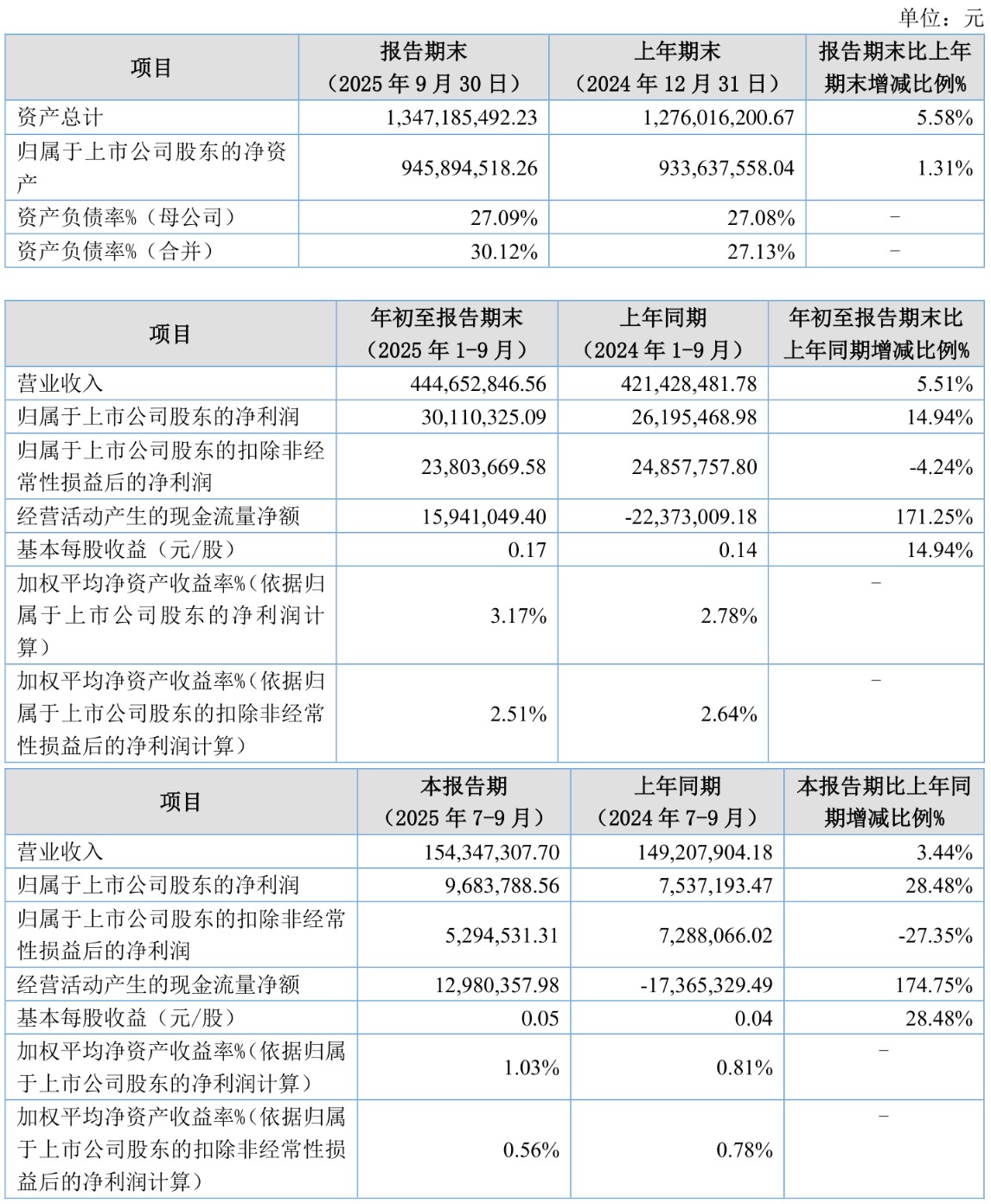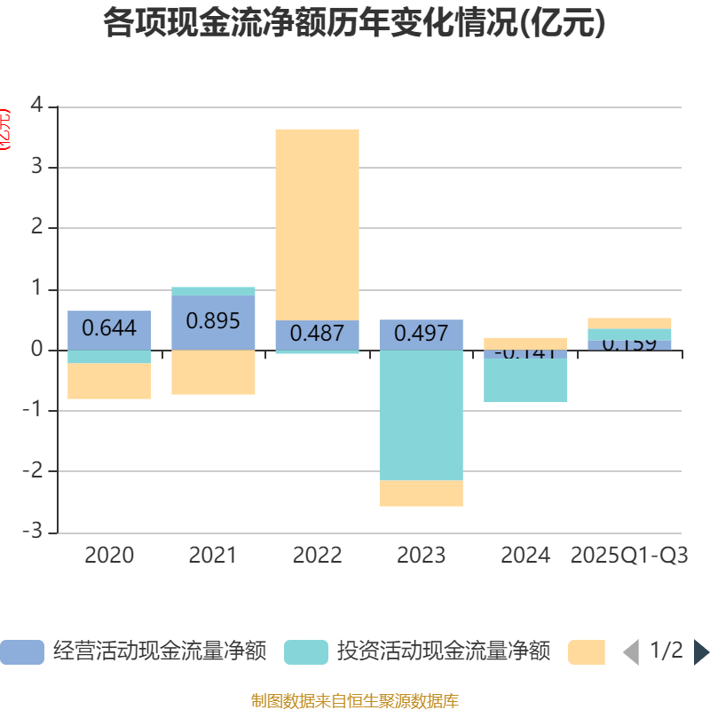 2025年前三季度,公司经营活动现金流净额为1594.1万元,同比增加3831.41万元;筹资活动现金流净额1736.44万元,同比减少3843.61万元;投资活动现金流净额1905.71万元,上年同期为-1.05亿元。