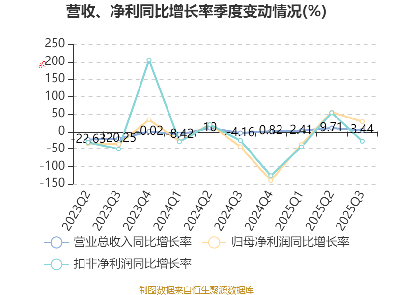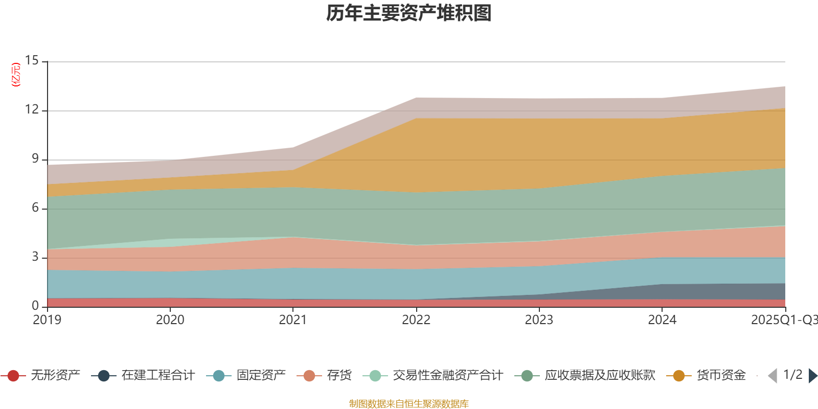 资产重大变化方面,截至2025年三季度末,公司存货较上年末增加22.47%,占公司总资产比重上升1.94个百分点;固定资产较上年末减少2.74%,占公司总资产比重下降1.02个百分点;应收票据及应收账款较上年末增加2.64%,占公司总资产比重下降0.74个百分点;其他流动资产较上年末减少17%,占公司总资产比重下降0.39个百分点。
