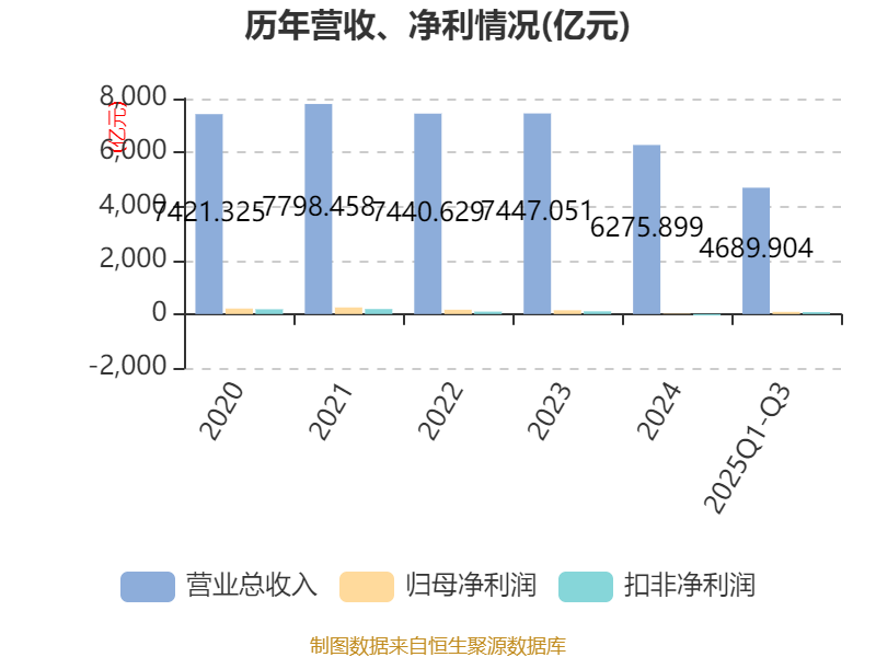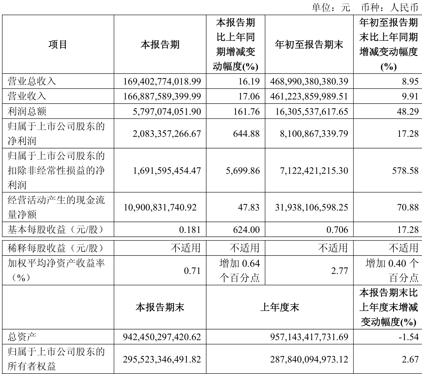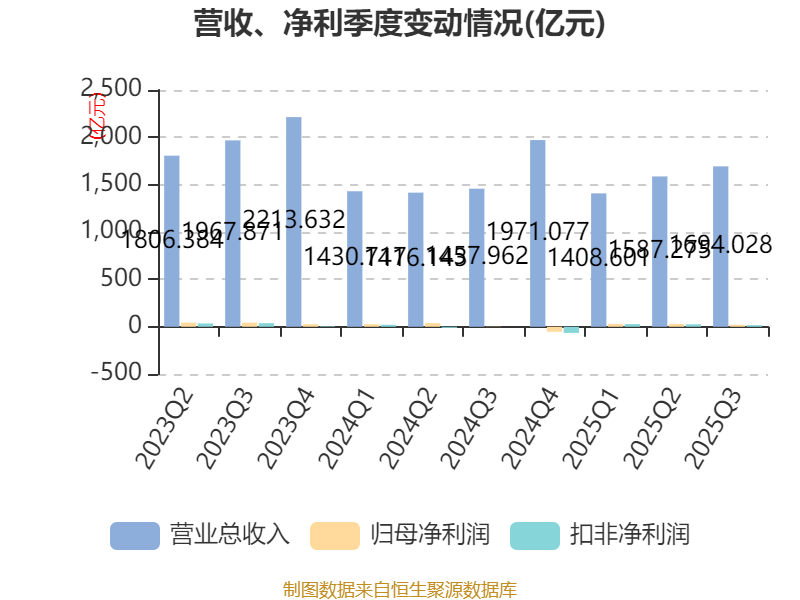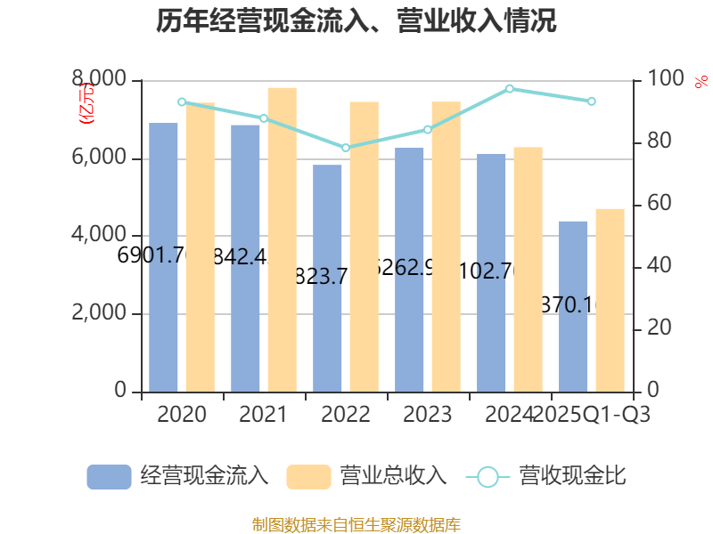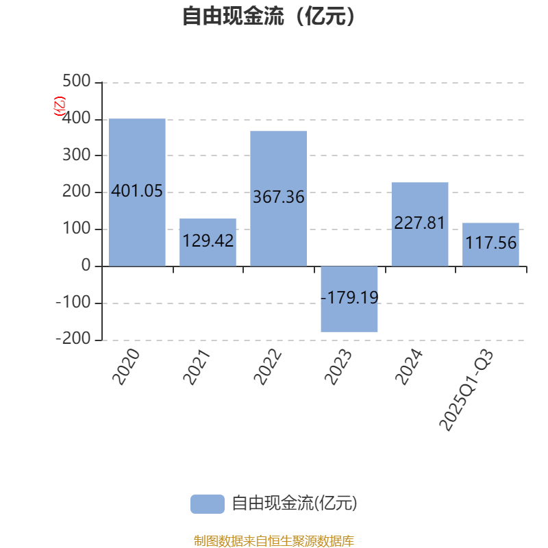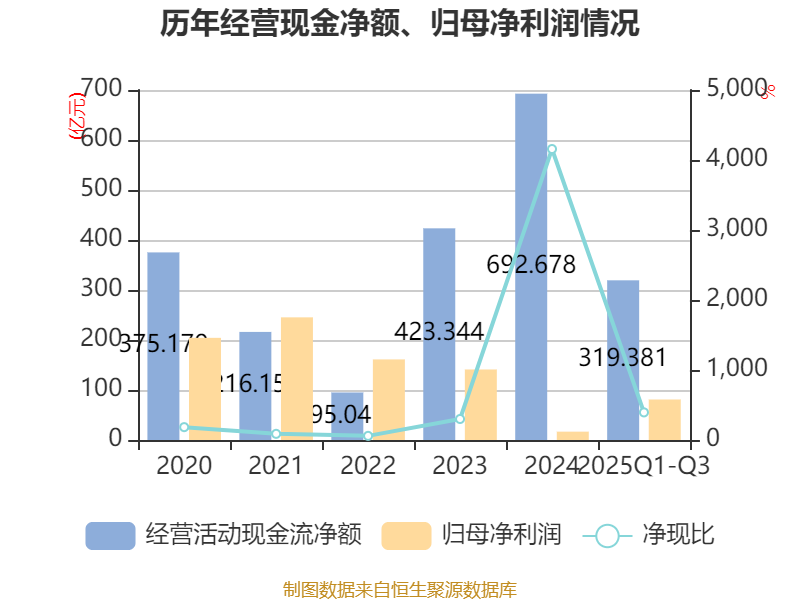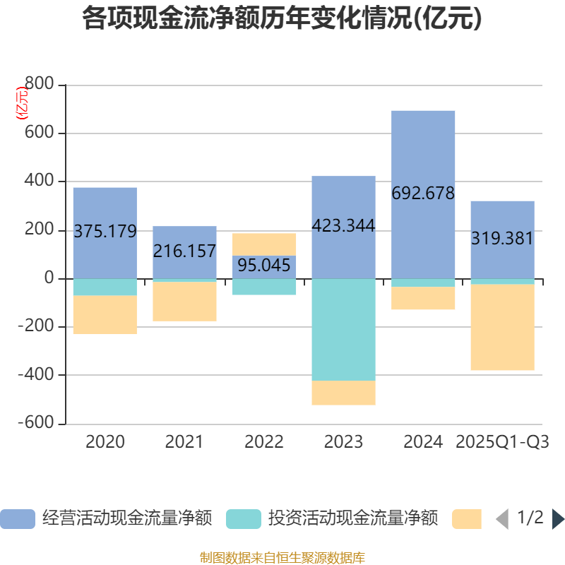 2025年前三季度,公司经营活动现金流净额为319.38亿元,同比增长70.88%;筹资活动现金流净额-354.74亿元,同比减少324.85亿元;投资活动现金流净额-24.68亿元,上年同期为105.94亿元。