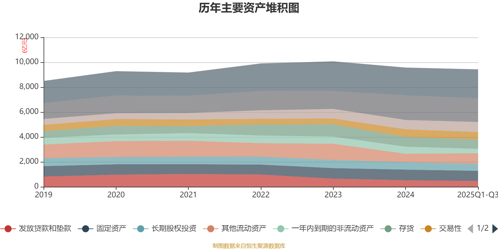 资产重大变化方面,截至2025年三季度末,公司一年内到期的非流动资产较上年末减少36.39%,占公司总资产比重下降2.1个百分点;其他流动资产较上年末增加25.81%,占公司总资产比重上升1.95个百分点;其他债权投资较上年末增加1530.88%,占公司总资产比重上升1.02个百分点;买入返售金融资产较上年末增加125.08%,占公司总资产比重上升0.85个百分点。