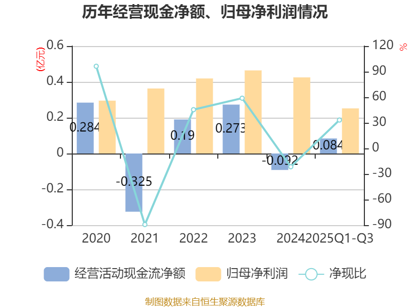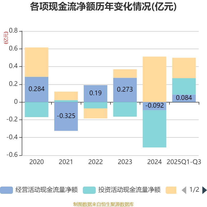 2025年前三季度,公司经营活动现金流净额为838.21万元,同比增加4452.16万元;筹资活动现金流净额2302.59万元,同比减少6025.11万元;投资活动现金流净额1851.47万元,上年同期为-1.01亿元。
