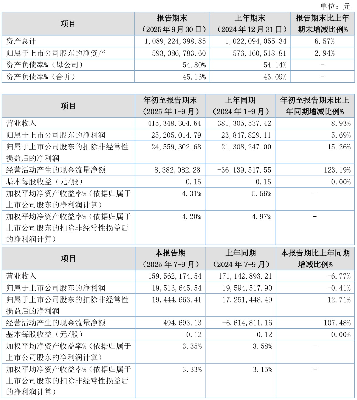 负债重大变化方面,截至2025年三季度末,公司应付票据及应付账款较上年末减少2.7%,占公司总资产比重下降2.86个百分点;一年内到期的非流动负债较上年末增加720.99%,占公司总资产比重上升2.13个百分点;合同负债较上年末增加500.82%,占公司总资产比重上升1.93个百分点;短期借款较上年末增加729.02%,占公司总资产比重上升1个百分点。
