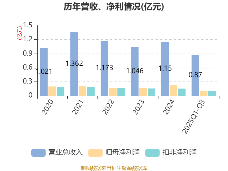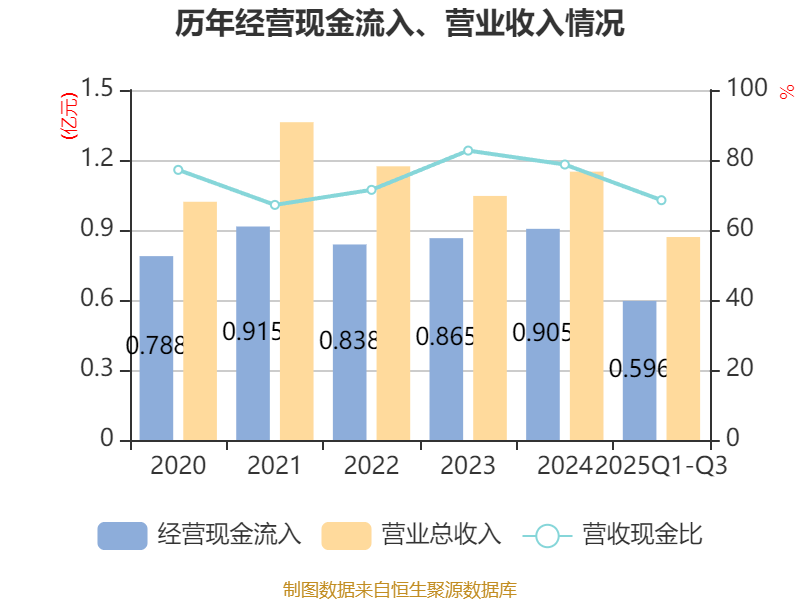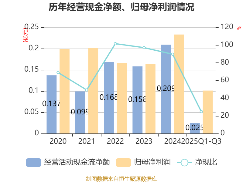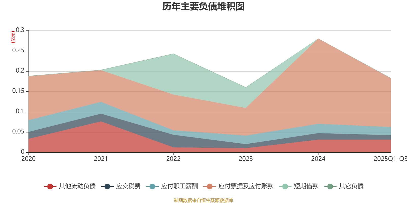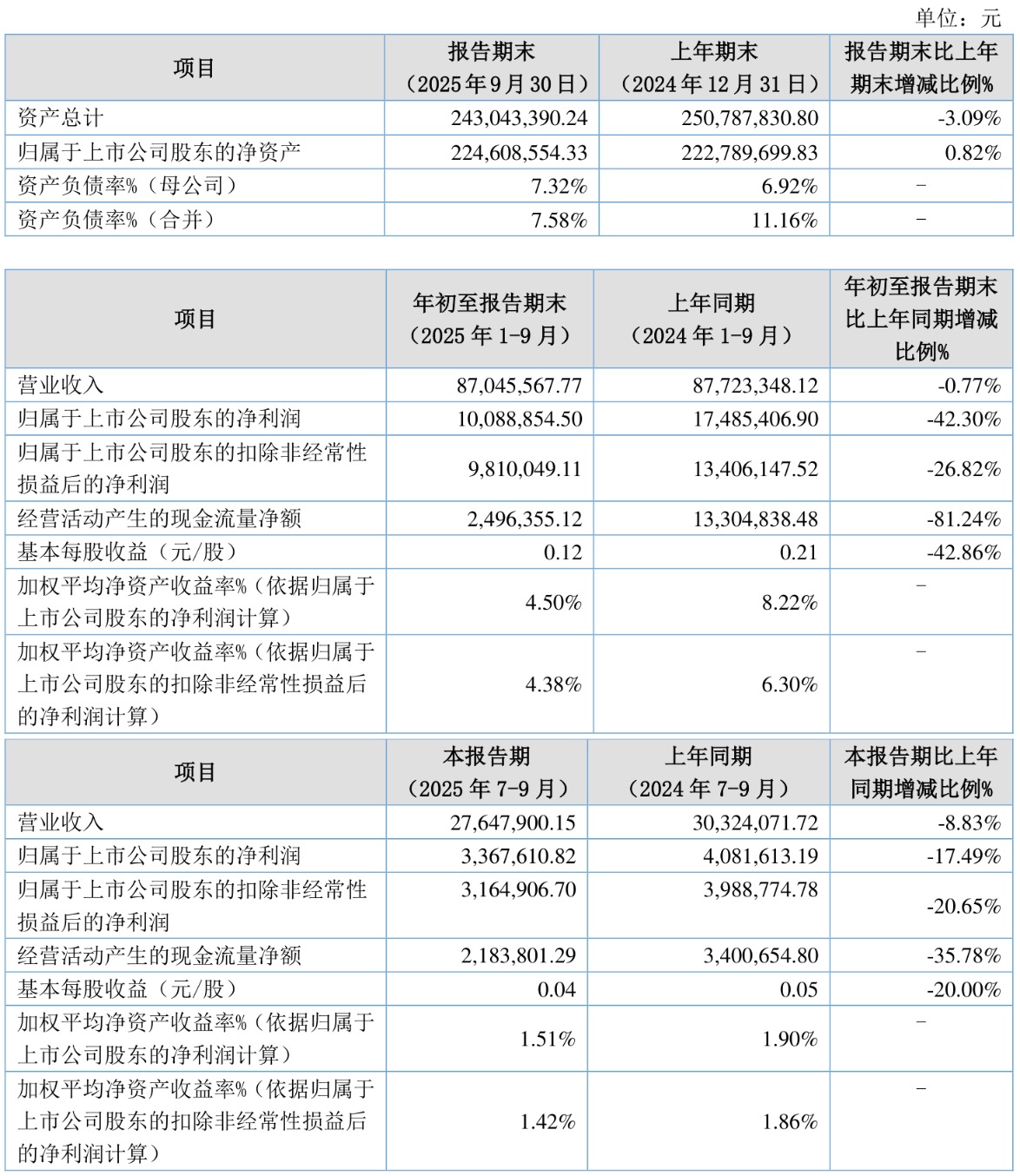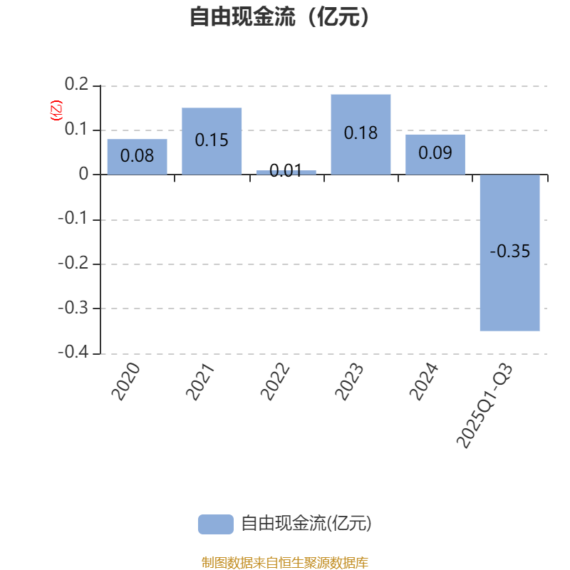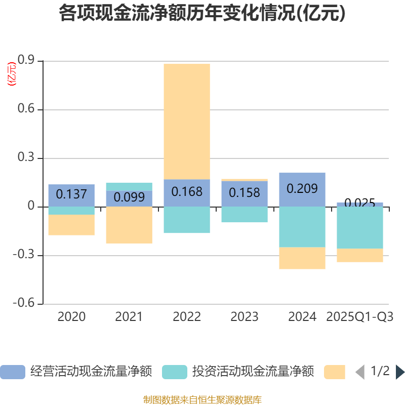 2025年前三季度,公司经营活动现金流净额为249.64万元,同比下降81.24%;筹资活动现金流净额-827万元,同比增加514.33万元;投资活动现金流净额-2596.69万元,上年同期为-2164.47万元。