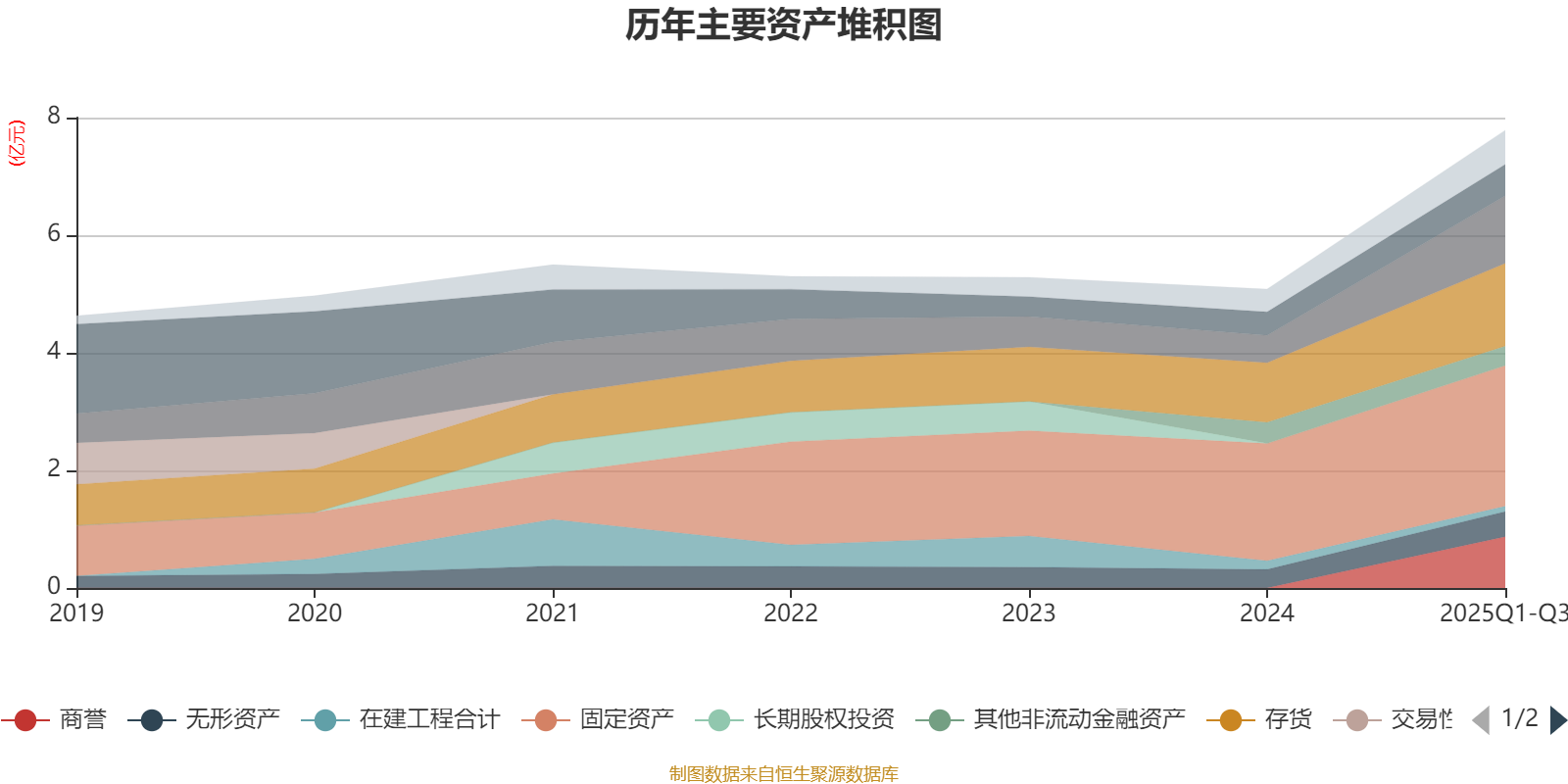 资产重大变化方面,截至2025年三季度末,公司商誉占公司总资产的11.19%,上年末为0;固定资产较上年末增加19.93%,占公司总资产比重下降8.53个百分点;应收票据及应收账款较上年末增加146.69%,占公司总资产比重上升5.6个百分点;其他非流动金融资产较上年末减少7.71%,占公司总资产比重下降2.8个百分点。