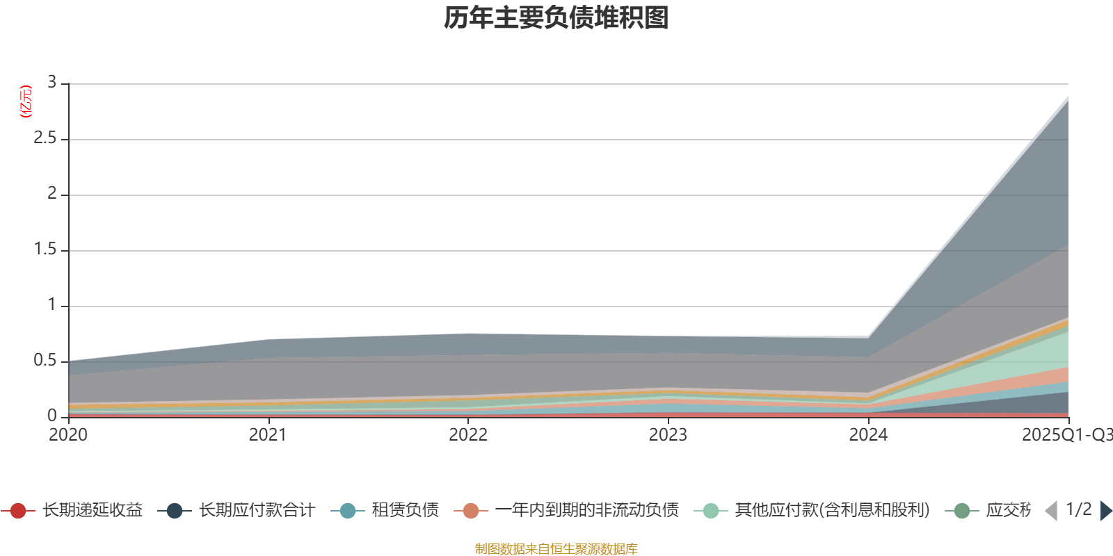 负债重大变化方面,截至2025年三季度末,公司短期借款较上年末增加661.39%,占公司总资产比重上升13.31个百分点;其他应付款(含利息和股利)较上年末增加2900.11%,占公司总资产比重上升3.83个百分点;长期应付款合计占公司总资产的2.44%,上年末为0;应付票据及应付账款较上年末增加103.69%,占公司总资产比重上升2.08个百分点。
