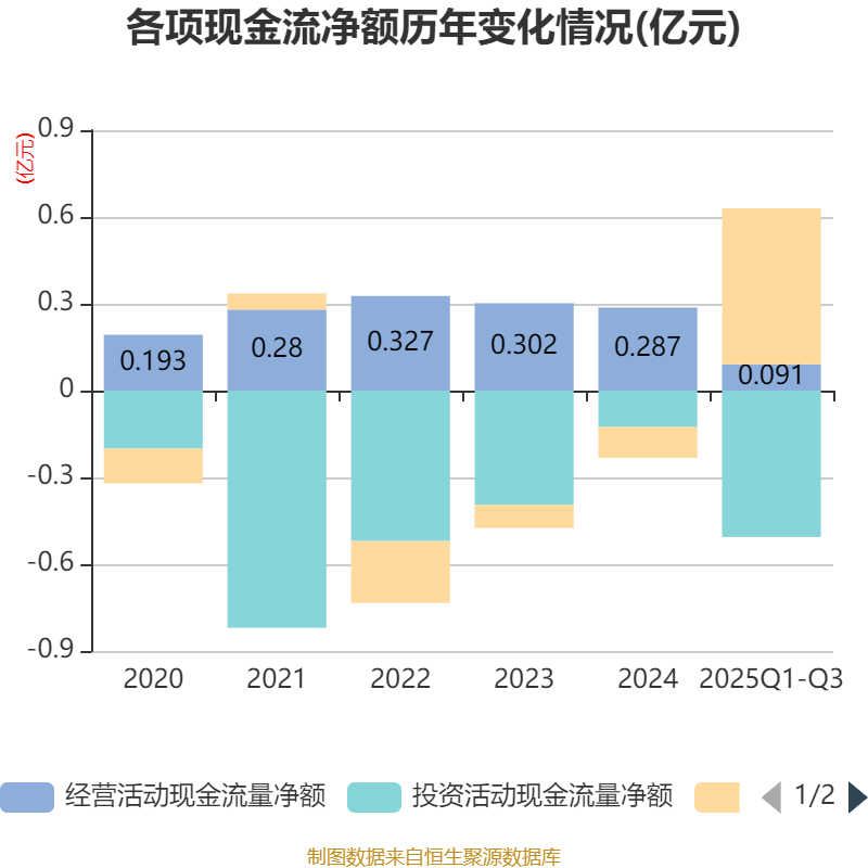 2025年前三季度,公司经营活动现金流净额为913.83万元,同比下降41.08%;筹资活动现金流净额5394.56万元,同比增加5582.46万元;投资活动现金流净额-5057.98万元,上年同期为-1172.75万元。