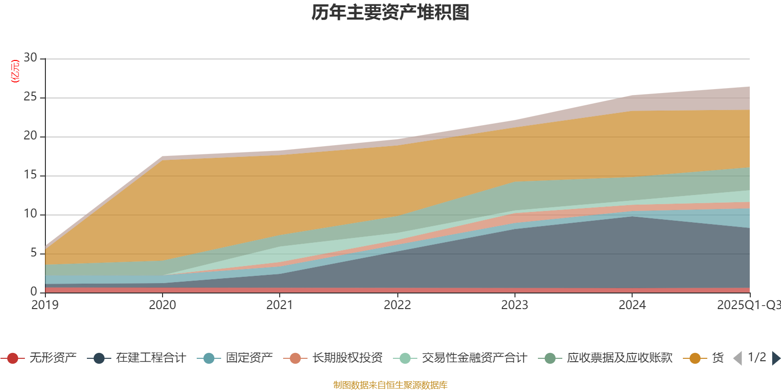 资产重大变化方面,截至2025年三季度末,公司在建工程合计较上年末减少16.24%,占公司总资产比重下降7.19个百分点;固定资产较上年末增加262.81%,占公司总资产比重上升6.78个百分点;货币资金较上年末减少12.95%,占公司总资产比重下降5.58个百分点;交易性金融资产合计较上年末增加169.67%,占公司总资产比重上升3.51个百分点。