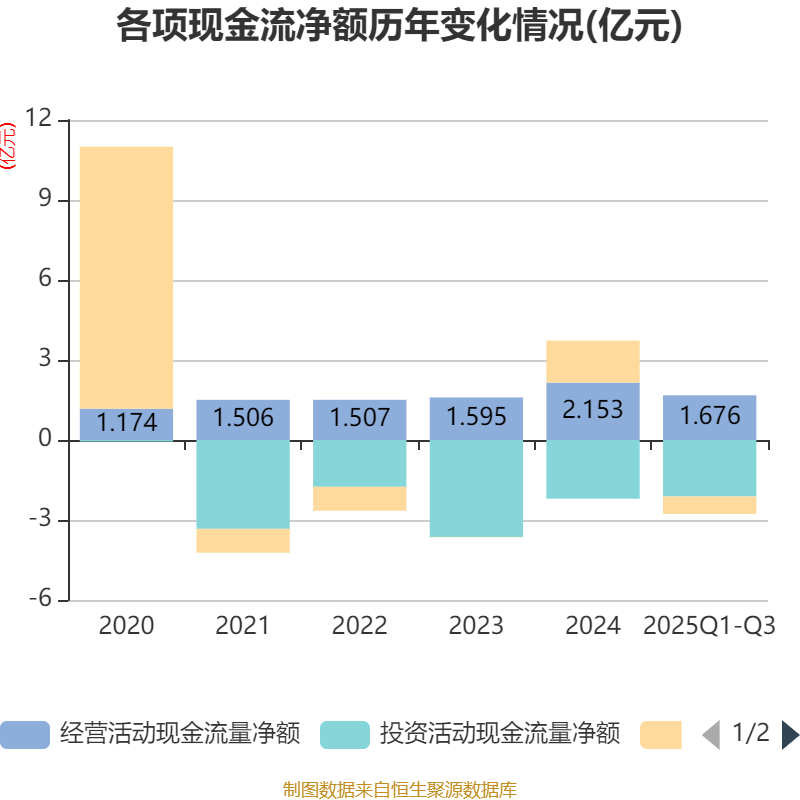 2025年前三季度,公司经营活动现金流净额为1.68亿元,同比下降1.4%;筹资活动现金流净额-6531.69万元,同比减少2.53亿元;投资活动现金流净额-2.12亿元,上年同期为-4.23亿元。