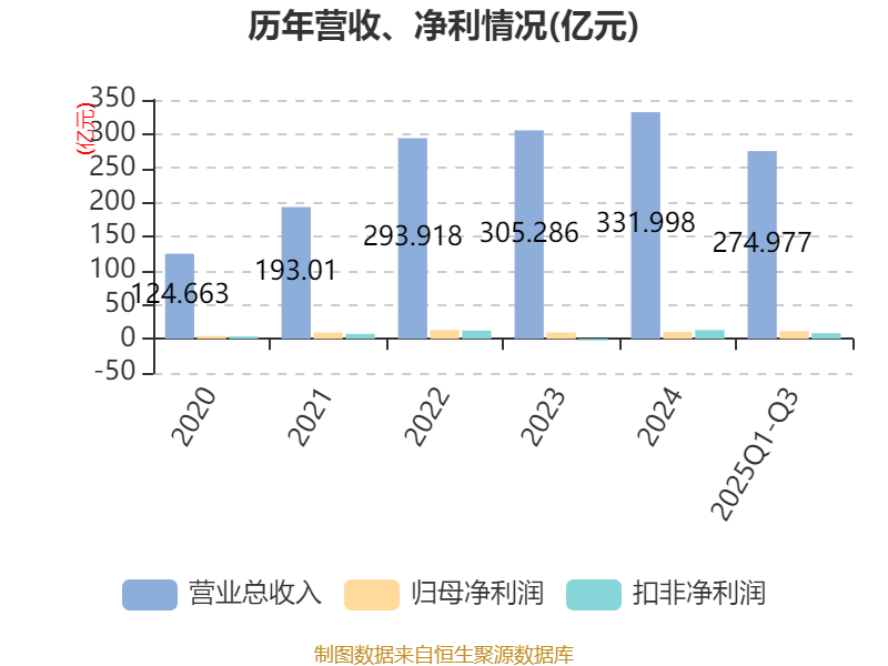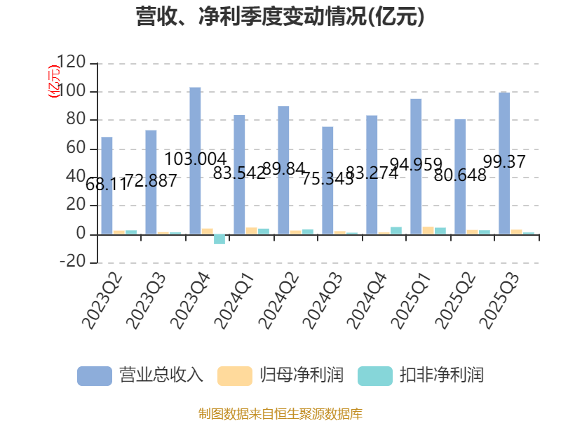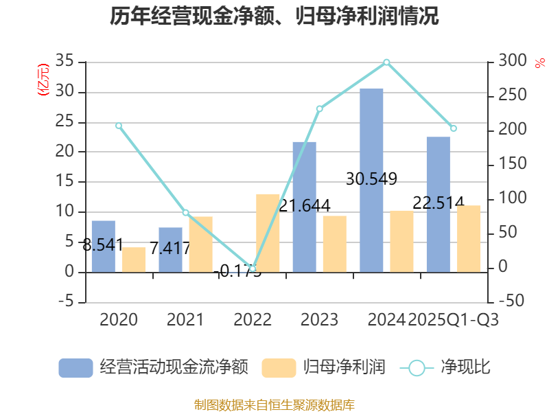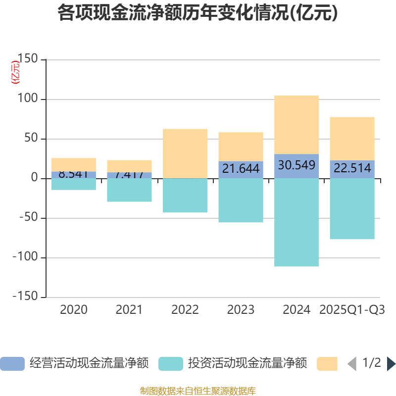 2025年前三季度,公司经营活动现金流净额为22.51亿元,同比增长9.7%;筹资活动现金流净额54.63亿元,同比增加10.48亿元;投资活动现金流净额-76.99亿元,上年同期为-85.79亿元。