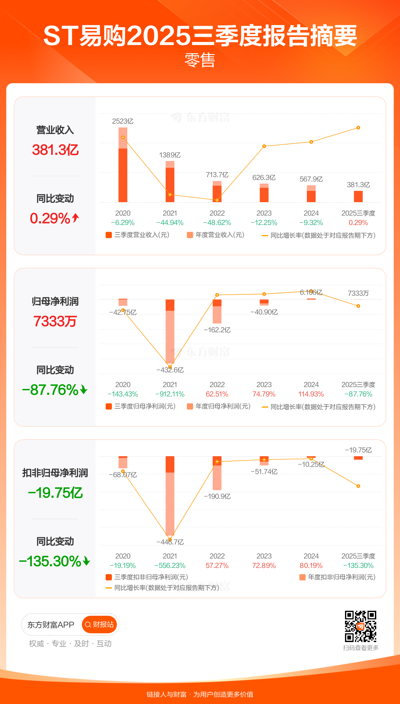 ST易购10月31日发布2025年三季报显示,公司前三季实现营业收入381.31亿元,同比增长0.29%;归母净利润7333.00万元,同比下滑87.76%;扣非归母净利润-19.75亿元。