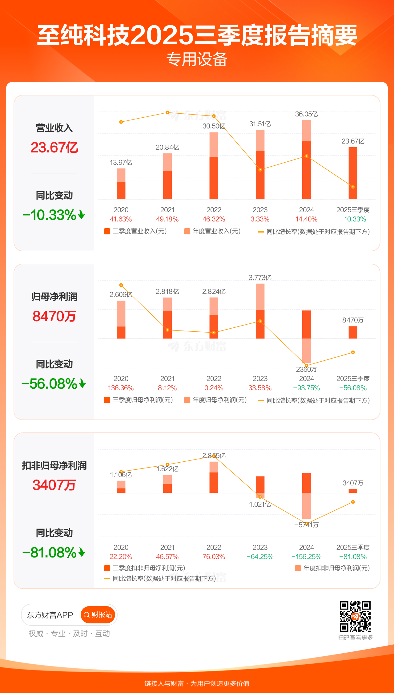 至纯科技10月31日发布2025年三季报显示,公司前三季实现营业收入23.67亿元,同比下滑10.33%;归母净利润8469.67万元,同比下滑56.08%;扣非归母净利润3407.19万元,同比下滑81.08%。